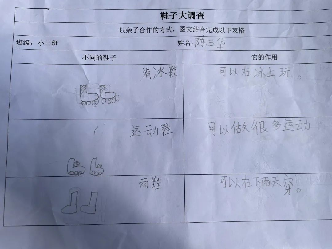 认识了鞋子的构造后,宝贝们回家和爸爸妈妈一起探讨了不同的鞋子有着不同的用途。雨靴是下雨天的时候穿的,可以防止我们的脚丫被雨淋湿;运动鞋是运动的时候穿的,能更好地帮助我们的小脚丫不在运动时受伤;拖鞋是居家休闲的时候穿的,方便穿脱;凉鞋是夏天的时候穿的,能让我们的脚丫子凉快。