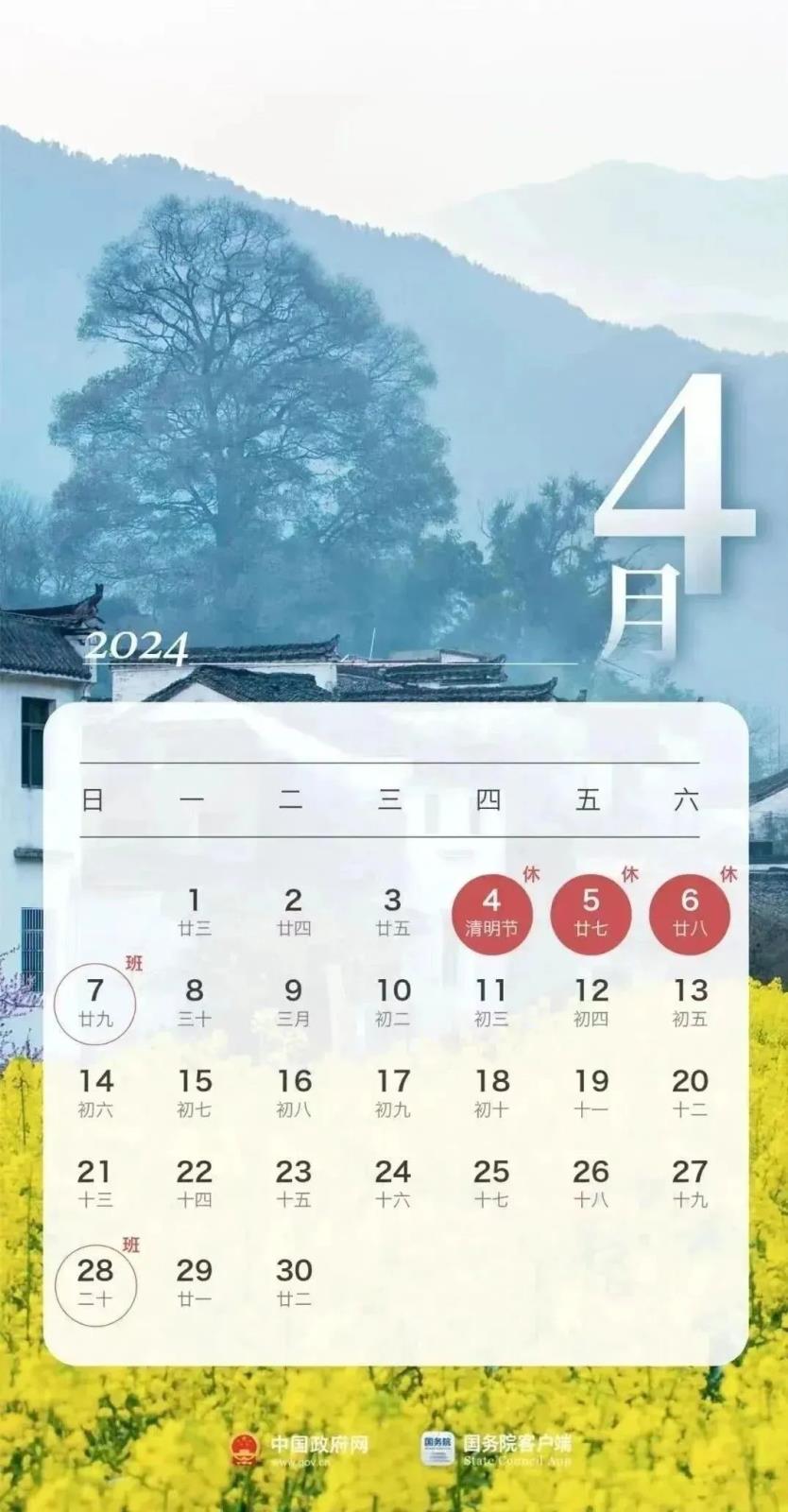 大家好!感谢大家一直以来对我园工作的支持与配合。我国传统节日清明节即将来临,根据《国务院办公厅关于2024年部分节假日安排的通知》,现将我园2024年清明节放假时间及注意事项告知如下,望各位家长朋友配合,做好孩子的安全、教育工作。