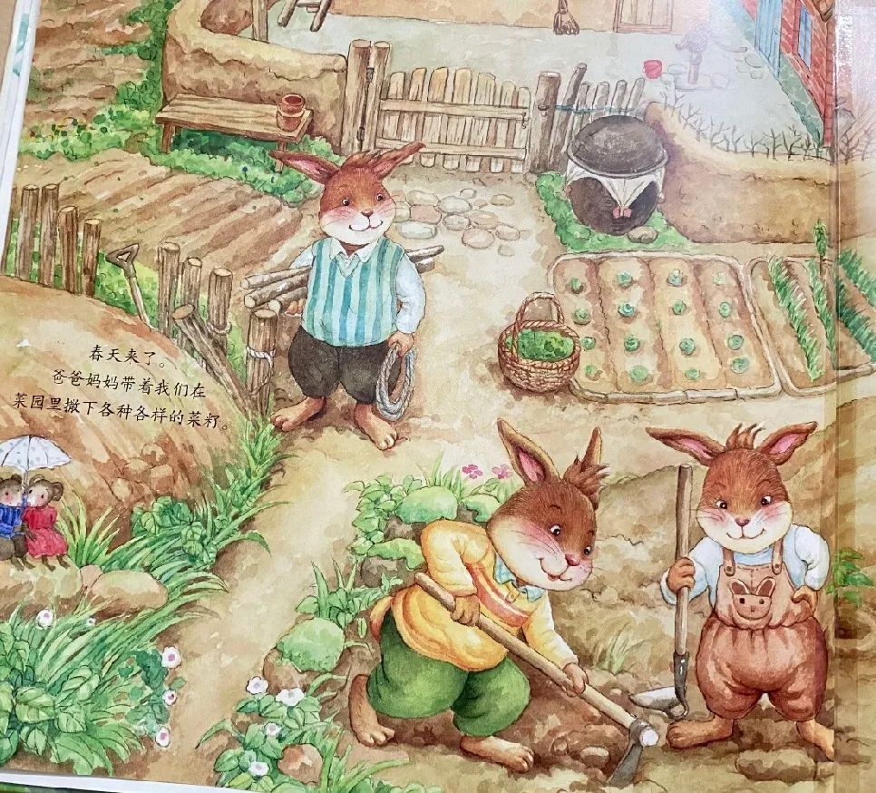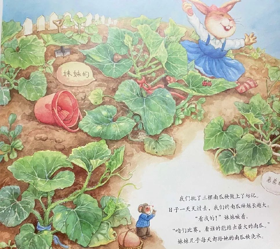妹妹的大南瓜讲述了一个温馨有趣的故事。土坯房、土院墙、衣绳上鲜艳的大花被子、院门口的酱缸……生活在中国东北农村的兔子一家过着勤劳朴实、春种秋收的简单生活,兔丫头今天5岁了,全家在家门前的酱缸旁照了一张全家福,春天来了,兄妹三人在地里选了三颗南瓜秧来比赛,看谁种出的南瓜最大,因为哥哥和弟弟的小秘密,所以当然还是妹妹的南瓜最大了,可是怎么把大南瓜运回家呢?爸爸拉来平板车,邻居们都来帮忙运南瓜,同时也一起分享了收获的喜悦……