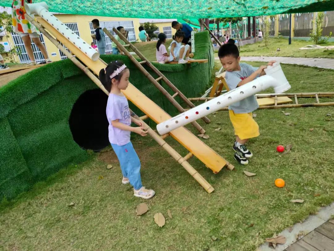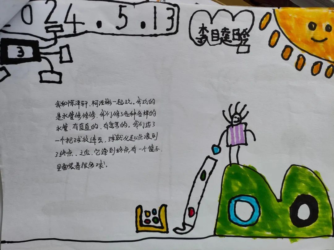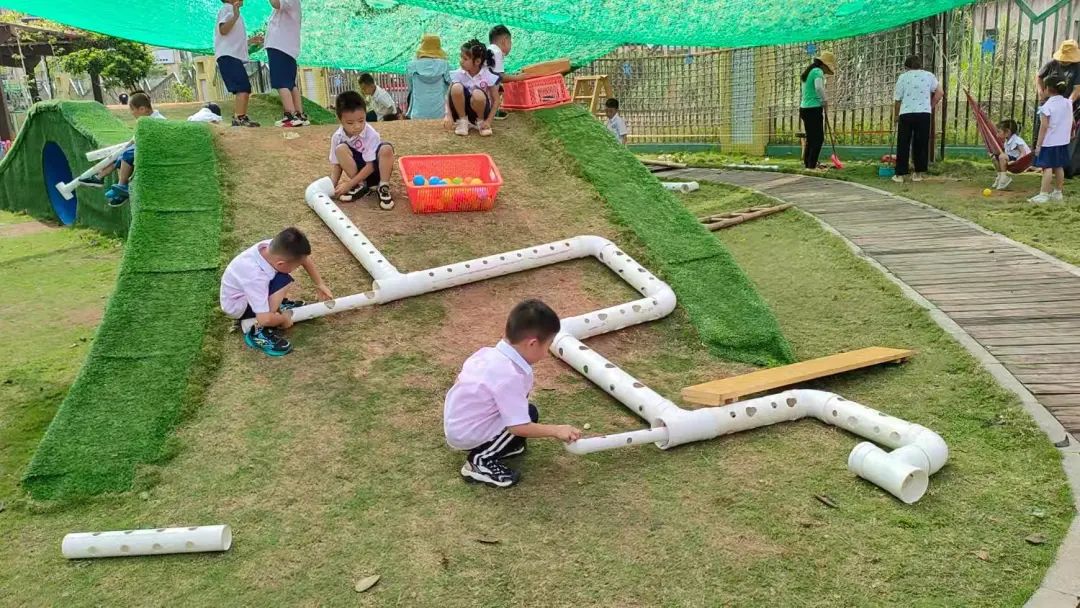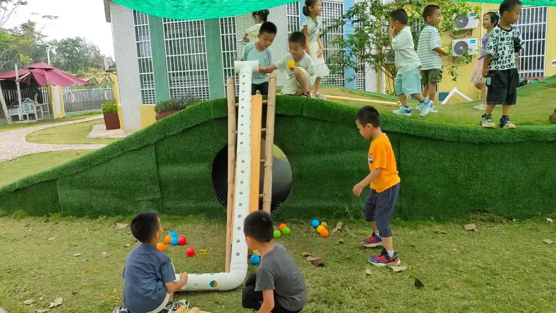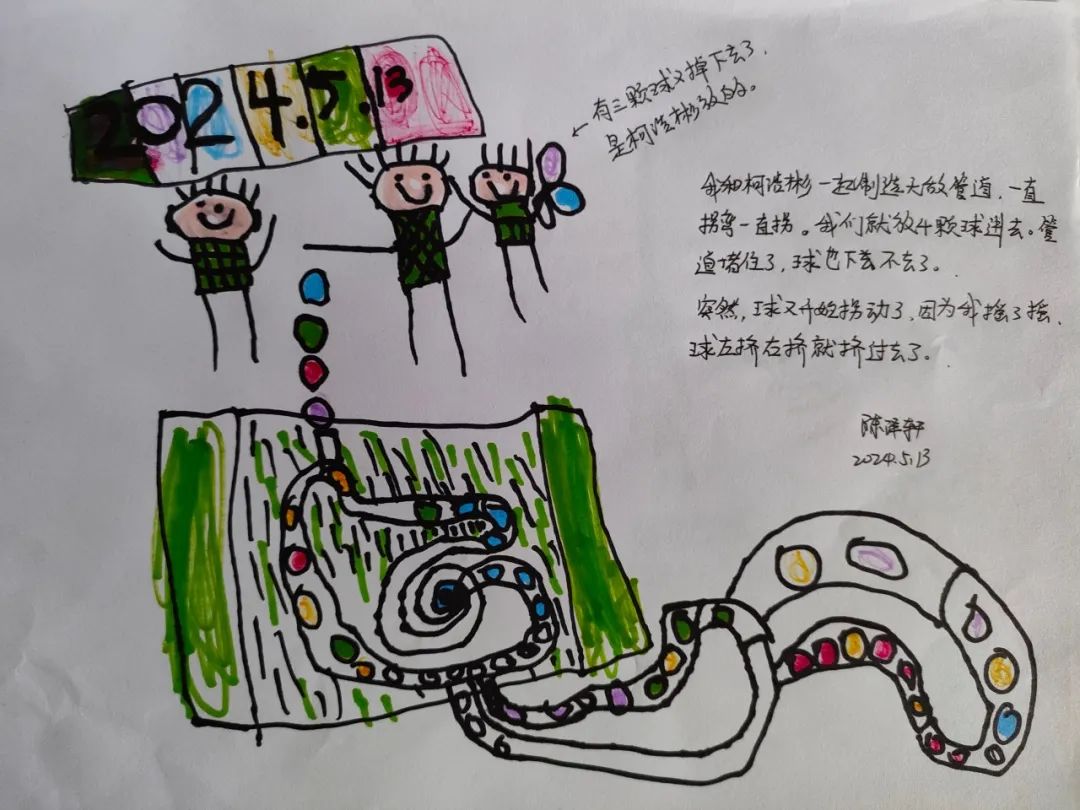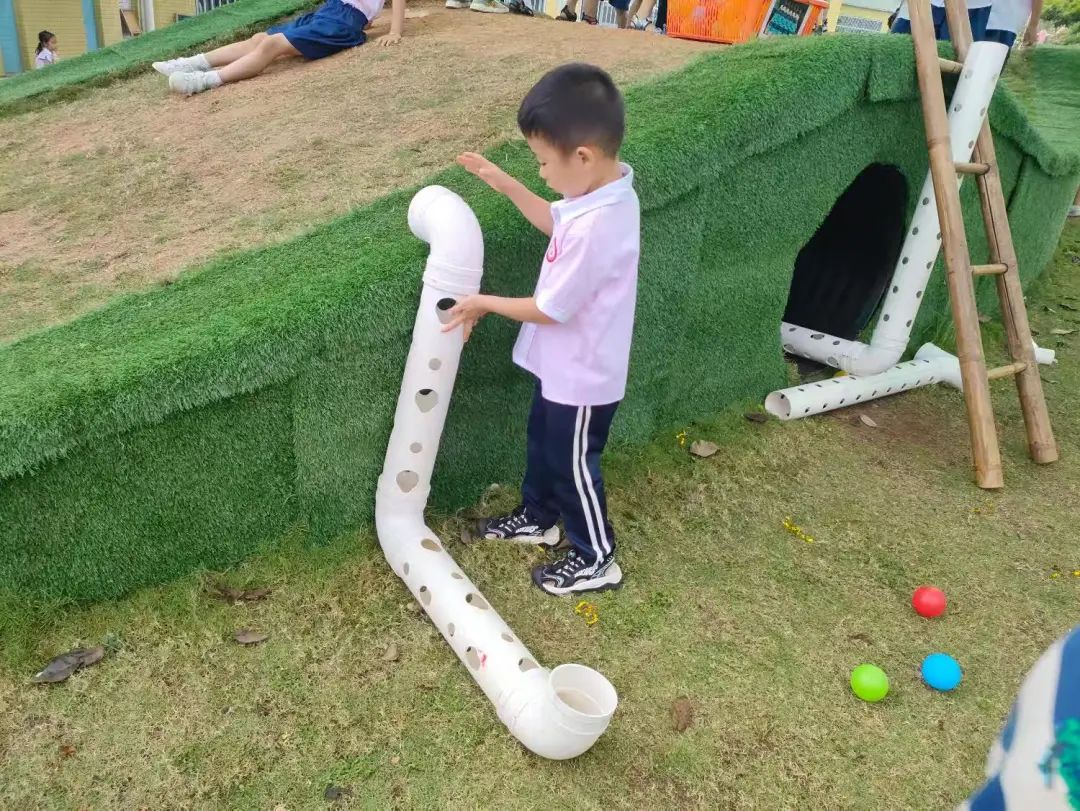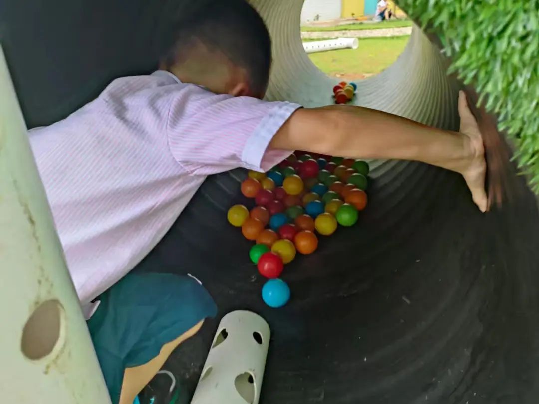 今天,李睦晗拼接一个“7”字型的管道,搭在山坡上,然后把球从上面的管道投进去,球从管道快速掉落下来,连续投五个球的时候,球堵在下面的端口,其他球只能堵在管口,这时王和裕说:我有个主意。说完就去找一个梯子搭在山坡上,李睦晗把管放在梯子上,但是梯子总是往下滑,李仕恩找来一块木板,搭在梯子上,接着陈泽轩拼接了一个长管道,再拼接一个弯管,正好顶在地面上,跑上山坡,从顶端投球,球也顺利滚下来。