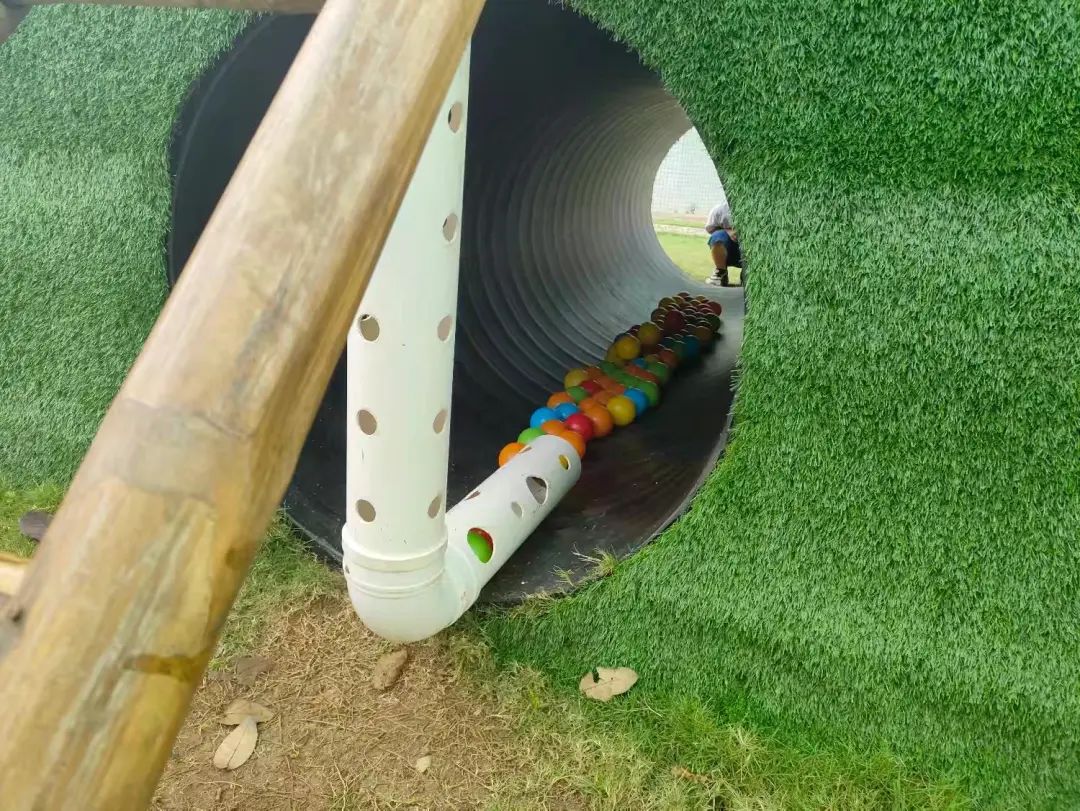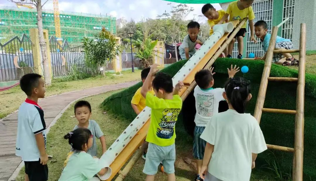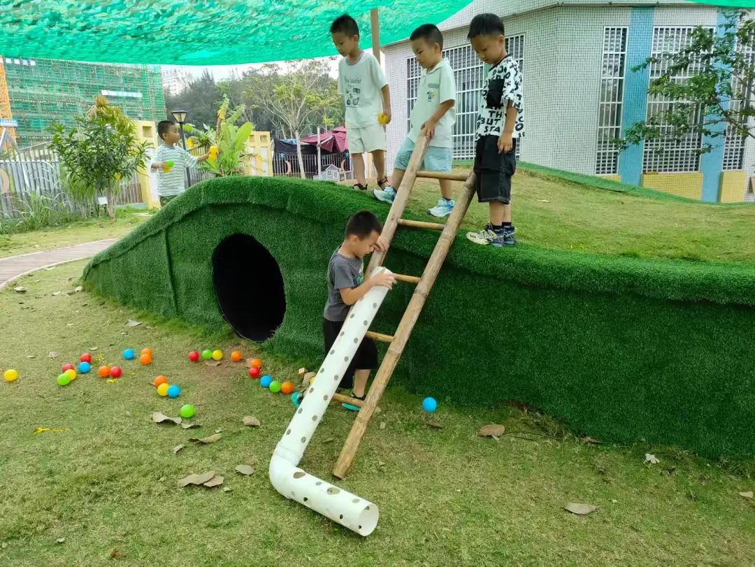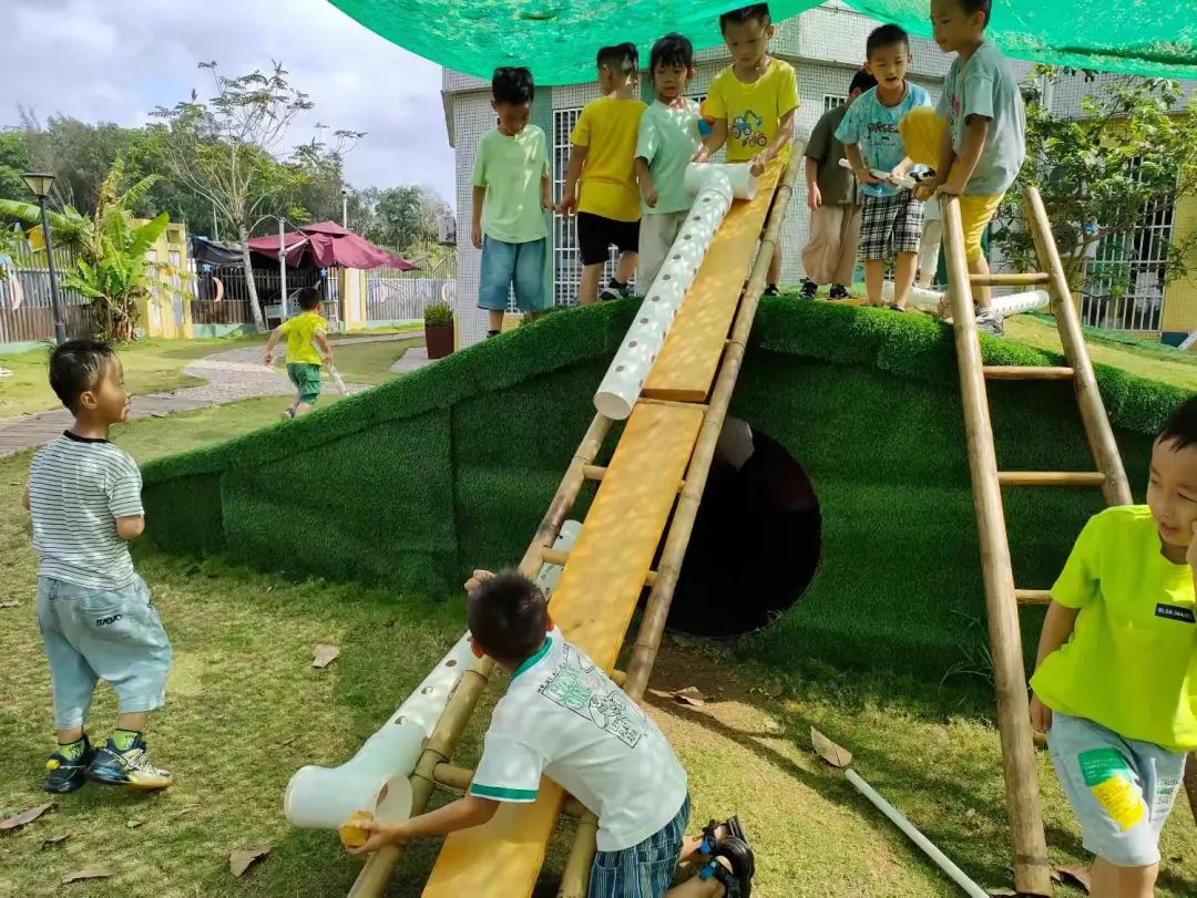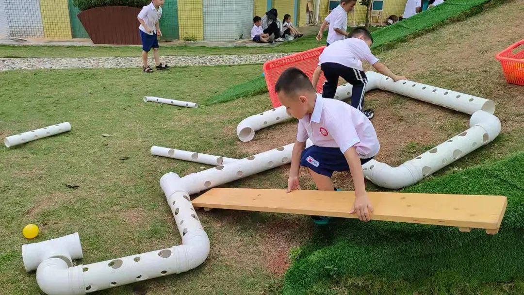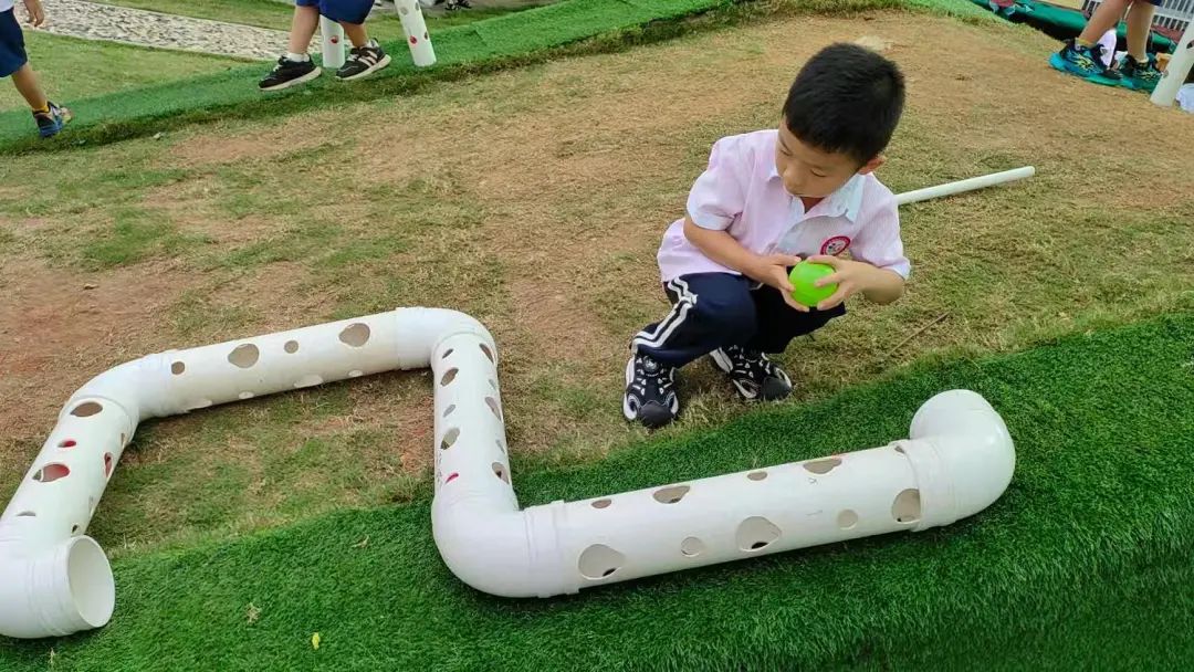 今天,李睦晗拼接一个“7”字型的管道,搭在山坡上,然后把球从上面的管道投进去,球从管道快速掉落下来,连续投五个球的时候,球堵在下面的端口,其他球只能堵在管口,这时王和裕说:我有个主意。说完就去找一个梯子搭在山坡上,李睦晗把管放在梯子上,但是梯子总是往下滑,李仕恩找来一块木板,搭在梯子上,接着陈泽轩拼接了一个长管道,再拼接一个弯管,正好顶在地面上,跑上山坡,从顶端投球,球也顺利滚下来。