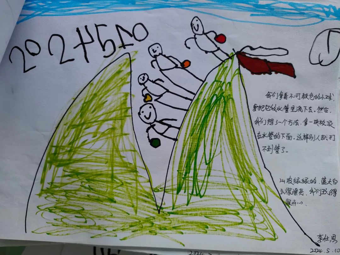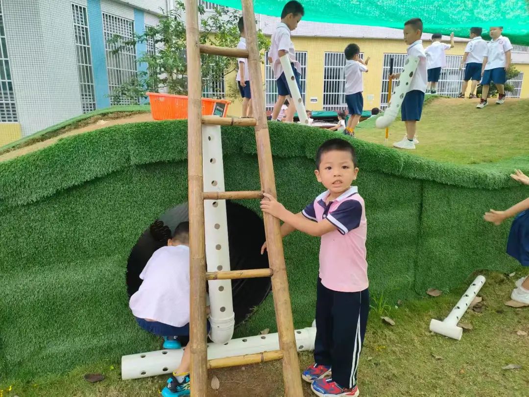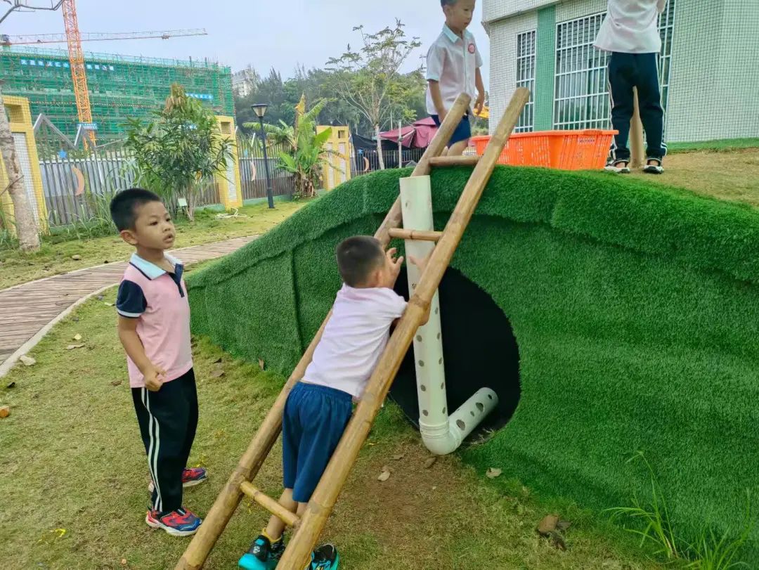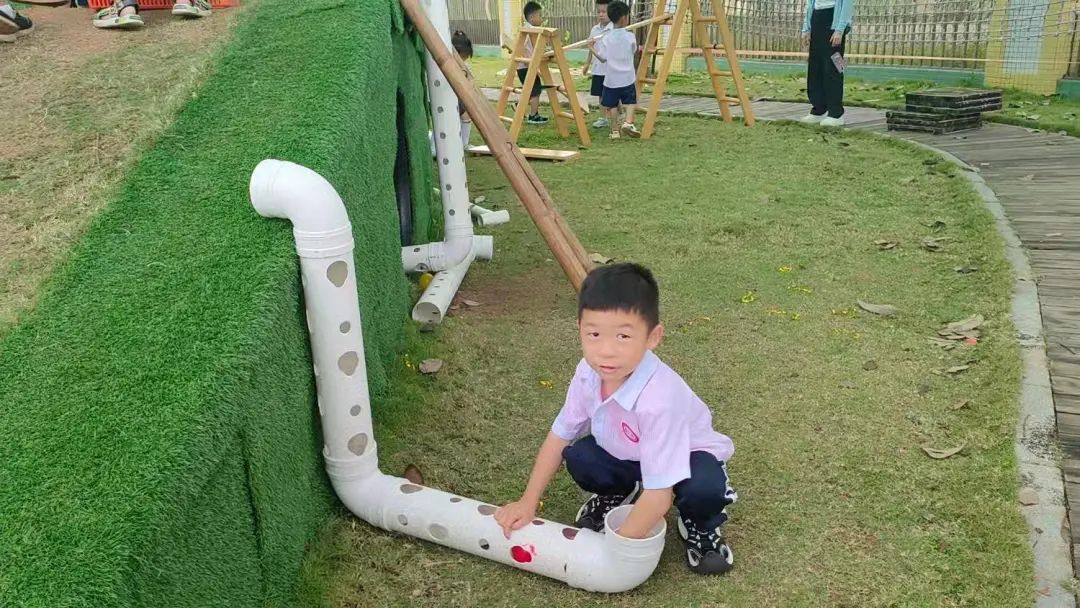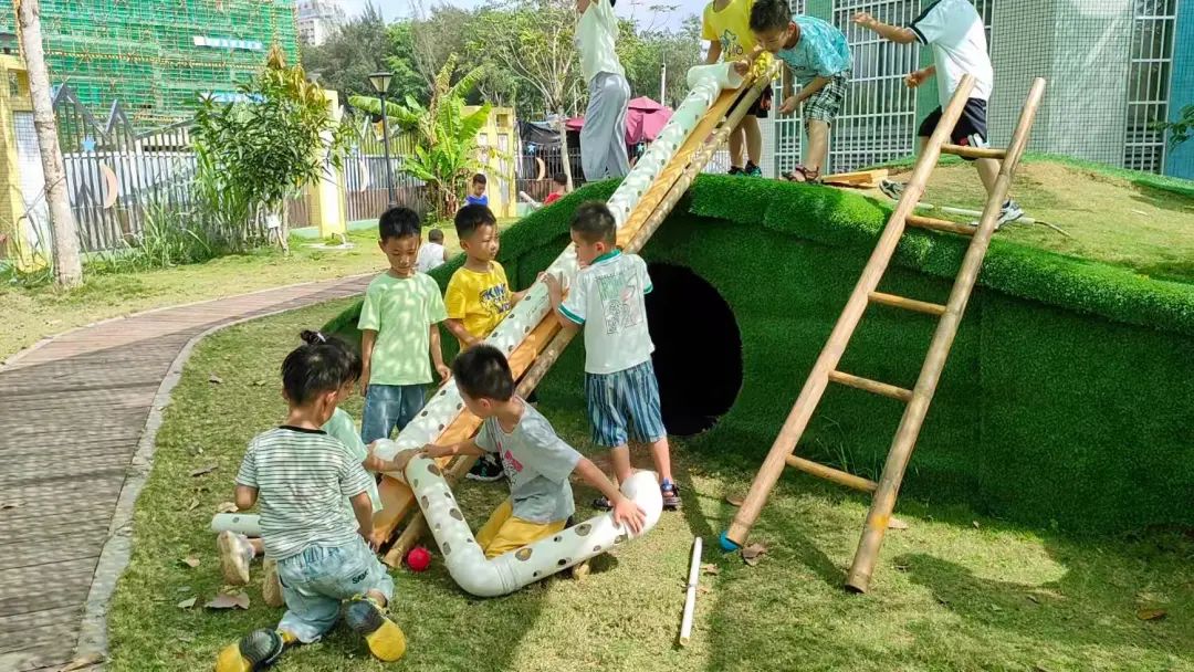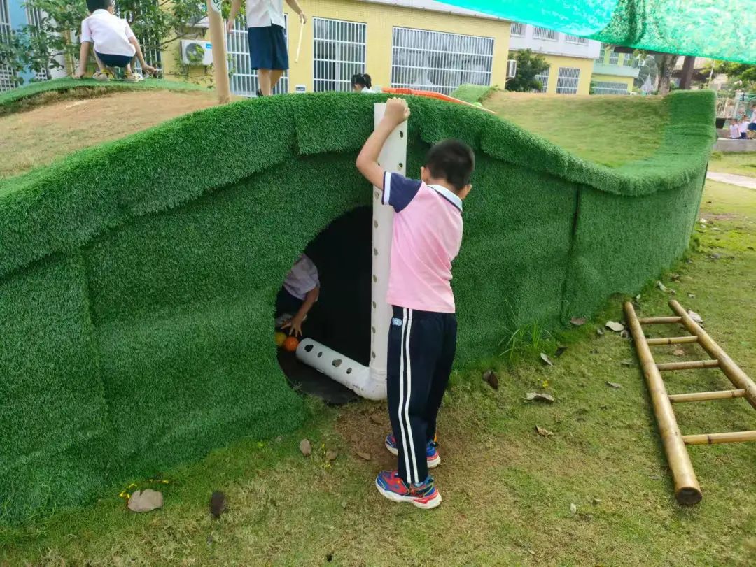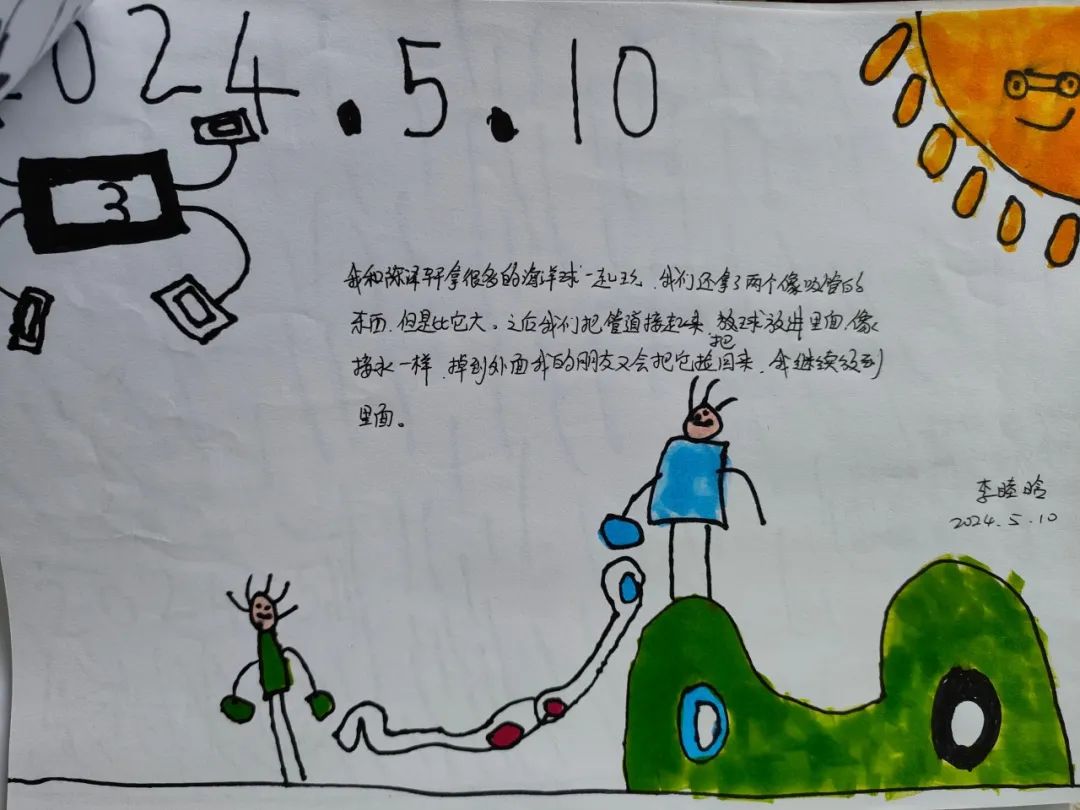 今天,李睦晗拼接一个“7”字型的管道,搭在山坡上,然后把球从上面的管道投进去,球从管道快速掉落下来,连续投五个球的时候,球堵在下面的端口,其他球只能堵在管口,这时王和裕说:我有个主意。说完就去找一个梯子搭在山坡上,李睦晗把管放在梯子上,但是梯子总是往下滑,李仕恩找来一块木板,搭在梯子上,接着陈泽轩拼接了一个长管道,再拼接一个弯管,正好顶在地面上,跑上山坡,从顶端投球,球也顺利滚下来。