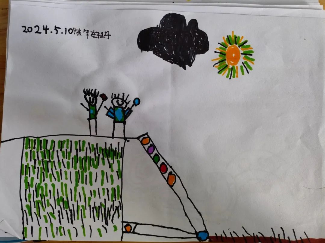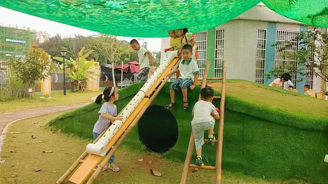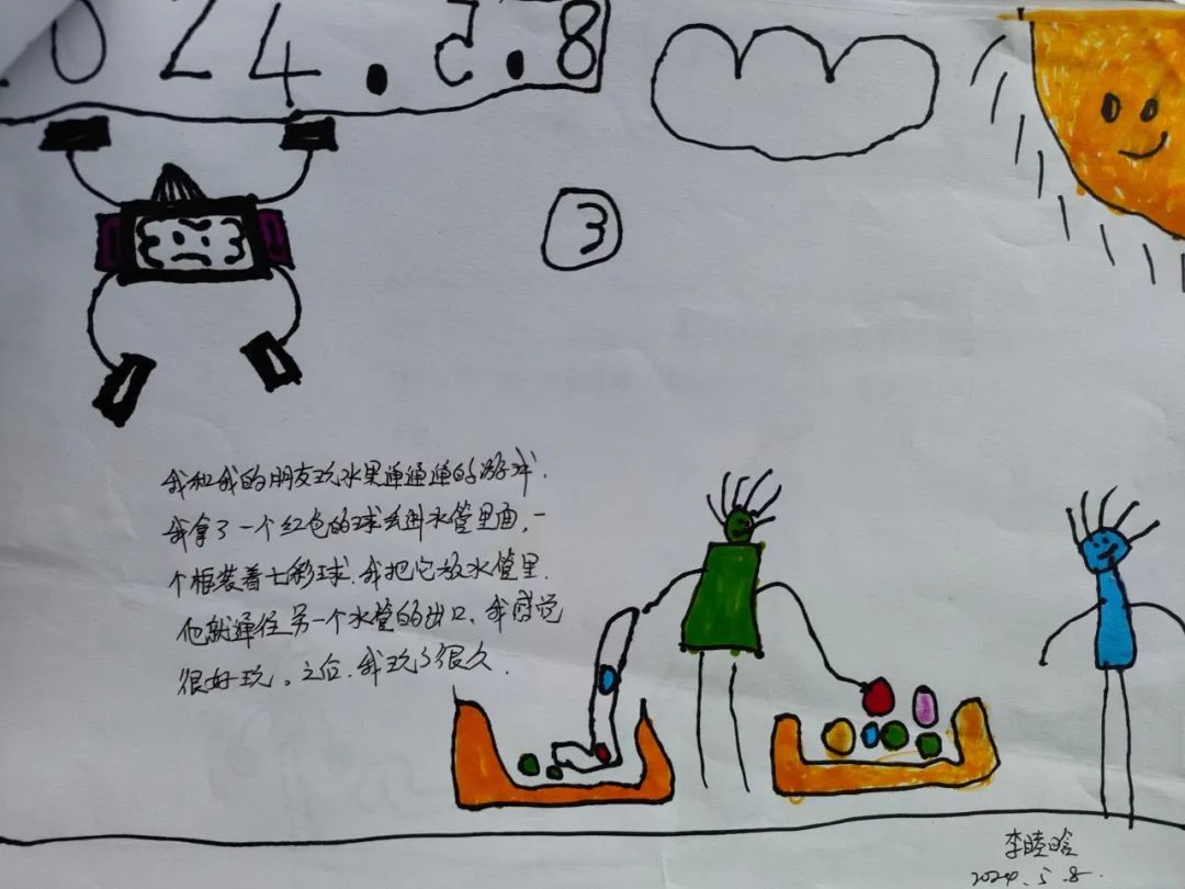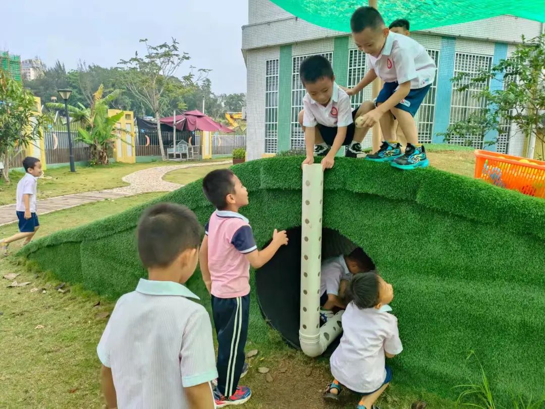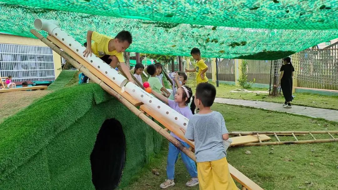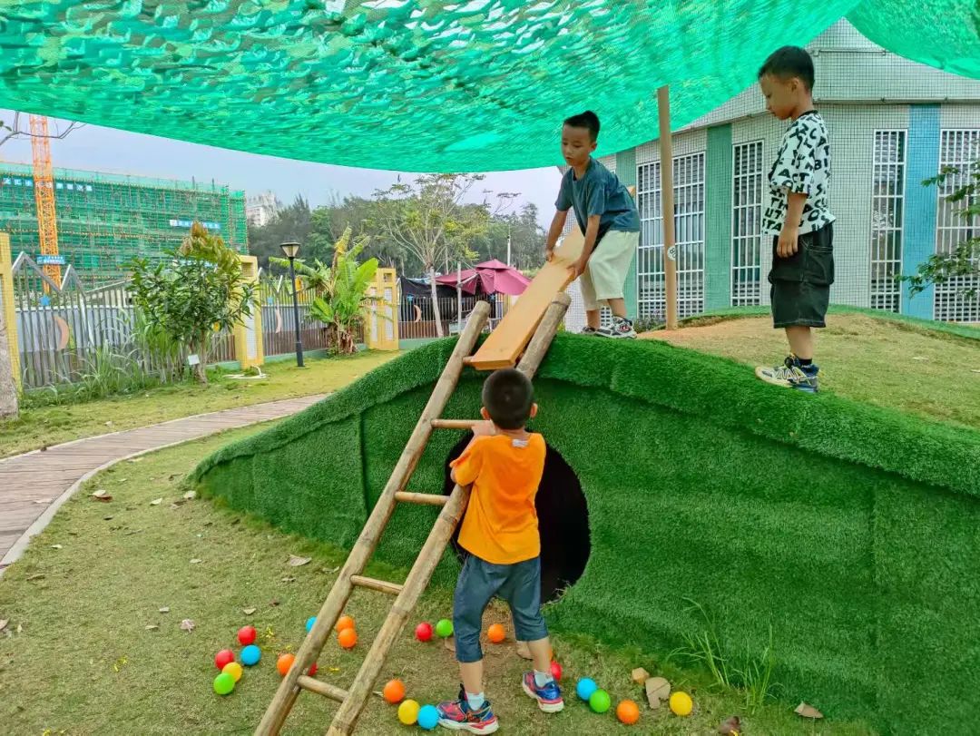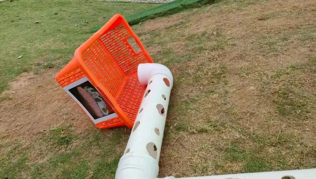 今天,李睦晗拼接一个“7”字型的管道,搭在山坡上,然后把球从上面的管道投进去,球从管道快速掉落下来,连续投五个球的时候,球堵在下面的端口,其他球只能堵在管口,这时王和裕说:我有个主意。说完就去找一个梯子搭在山坡上,李睦晗把管放在梯子上,但是梯子总是往下滑,李仕恩找来一块木板,搭在梯子上,接着陈泽轩拼接了一个长管道,再拼接一个弯管,正好顶在地面上,跑上山坡,从顶端投球,球也顺利滚下来。