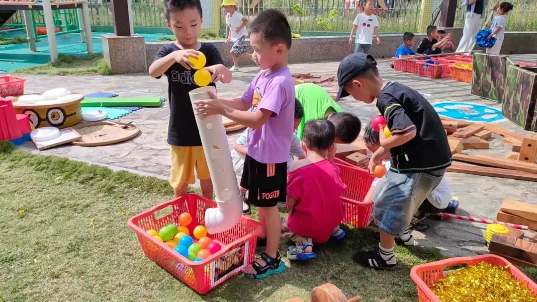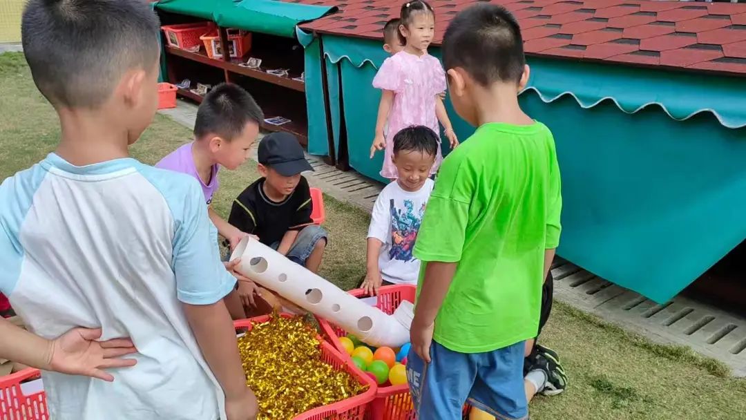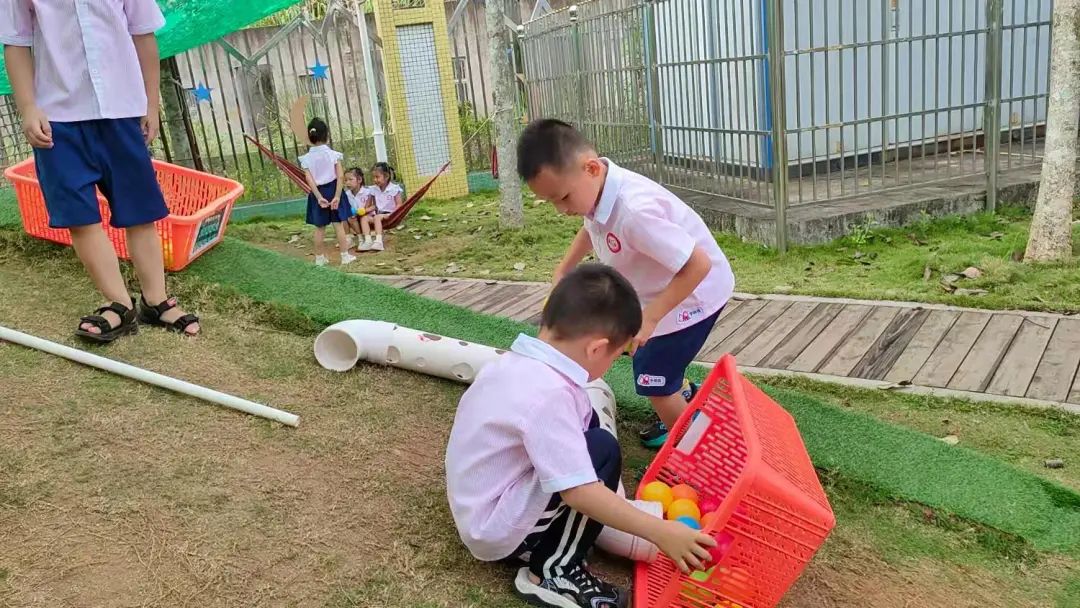 李睦晗和陈泽轩在山坡区选择了玩具筐,里面装了很多拉花,利用一个PVC管加一个弯管,第一次李睦晗把管竖起来,陈泽轩从管中投球,球掉落在筐里。陈泽轩建议把管直接放在装海洋球的筐里,捡球更快,第二次李睦晗同时把pvc管倾斜着放,海洋球顺着管直接滚到筐里,球太多,管口被堵住了,第三次李仕恩把管挪到一个空的玩具筐里。接着李睦晗又调整高度,这样球落下去就不会堵在管口。