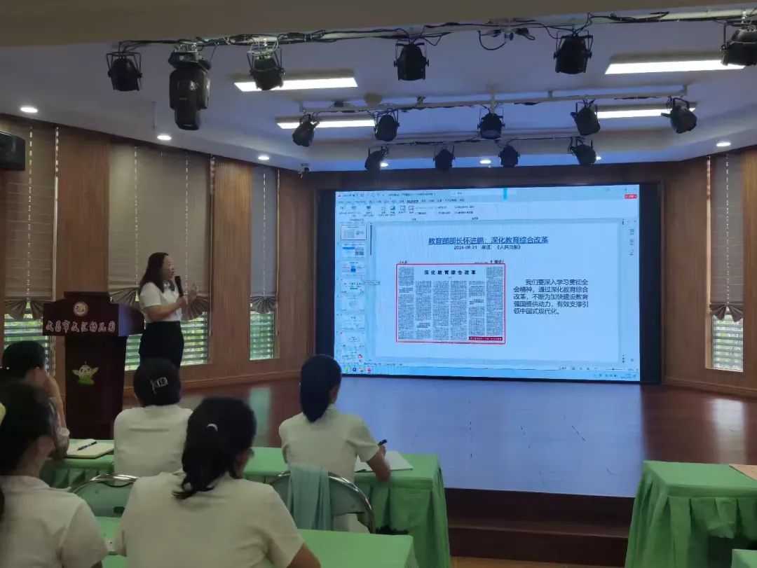 学为师之德,德为师之魂。在黄薇书记的带领下全体教职工对《学习党的二十届三中全会精神》《教育部部长怀进鹏:深化教育综合改革》《中共中央国务院关于弘扬教育家精神加强新时代高素质专业化教师队伍建设的意见》《学前教育法(草案)》等内容进行了系统的学习。黄薇书记强调,全体教师要认真学习、深刻领会其中的精神实质和具体要求,将其内化于心、外化于行,真正做到应知应做、必知必做。