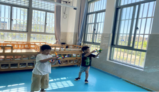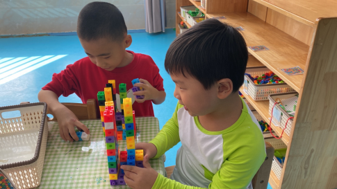 孩子们在室内自主游戏,舒寻和殷谆选择用彩色方块积木搭建飞机,随后开始了一场“战斗机打仗”的游戏。