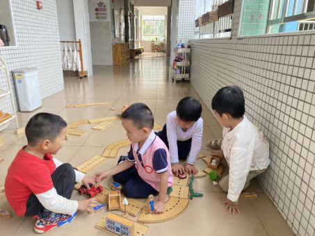 舒寻和其他三个小朋友在二楼平台走廊玩赛车游戏。孩子们共同用木质轨道拼接出一条长长的赛车道,并在赛车道上摆放了一些小型的建筑物模型,作为赛道中的标志性建筑。