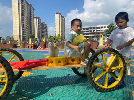 上午9:30,舒寻和王怡宸来到大庭院的万能工匠区,选择了万能工匠进行游戏。舒寻首先拿出一块长方形的木板,说:“我们来做一辆车吧!”王怡宸点点头,表示同意。舒寻开始尝试将木板立起来,但木板不稳,摇晃了几下就倒了。他皱了皱眉,对王怡宸说:“这块木板太长了,不好用。”王怡宸走到旁边,选了一块较短的木板,说:“我们试试这个。”他们一起将短木板放在地上,然后开始往上面拼接轮子。舒寻负责安装前轮,王怡宸安装后轮。安装过程中,舒寻发现一个轮子有点卡,他尝试了几次都装不上,便对王怡宸说:“这个轮子怎么装不上呀?”王怡宸走过来,仔细看了看,说:“你试试把这个地方对准一下。”舒寻按照王怡宸的指点,重新调整了一下轮子的位置,顺利地装上了。接下来,他们又一起在车身上安装了一些装饰品,例如红色塑料管。整个过程中,他们互相商量、互相帮助,没有发生争执。大约过了20分钟,他们合作完成了一辆小车。舒寻开心地说:“我们的小车做好了!”王怡宸也露出了笑容。