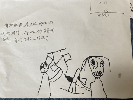 随后,他们俩模仿着战斗机飞行的声音和动作,一边玩一边进行着简单的对话,比如:“看我厉不厉害!”“你的飞机被击中了!”“我们一起打敌人吧!”......