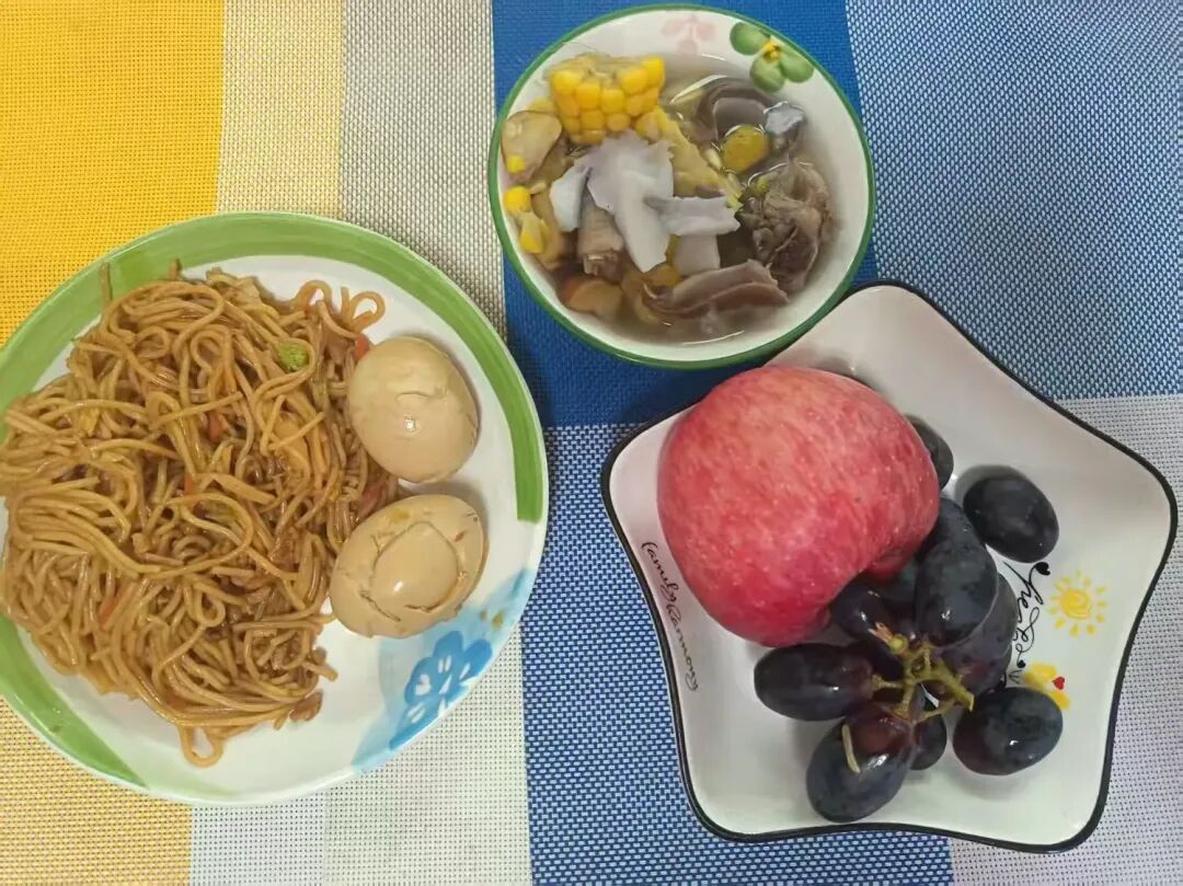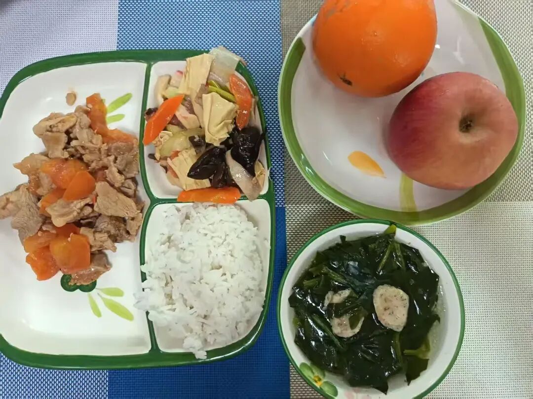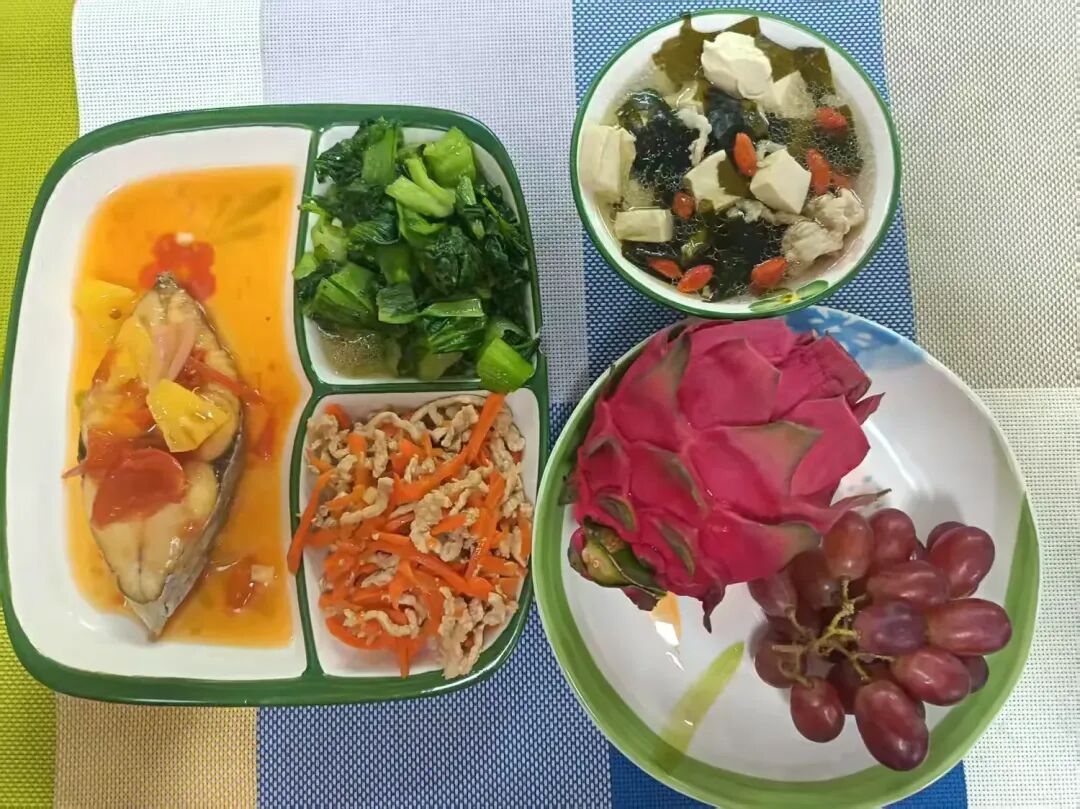 蒜炒青菜、裙带菜豆腐枸杞汤