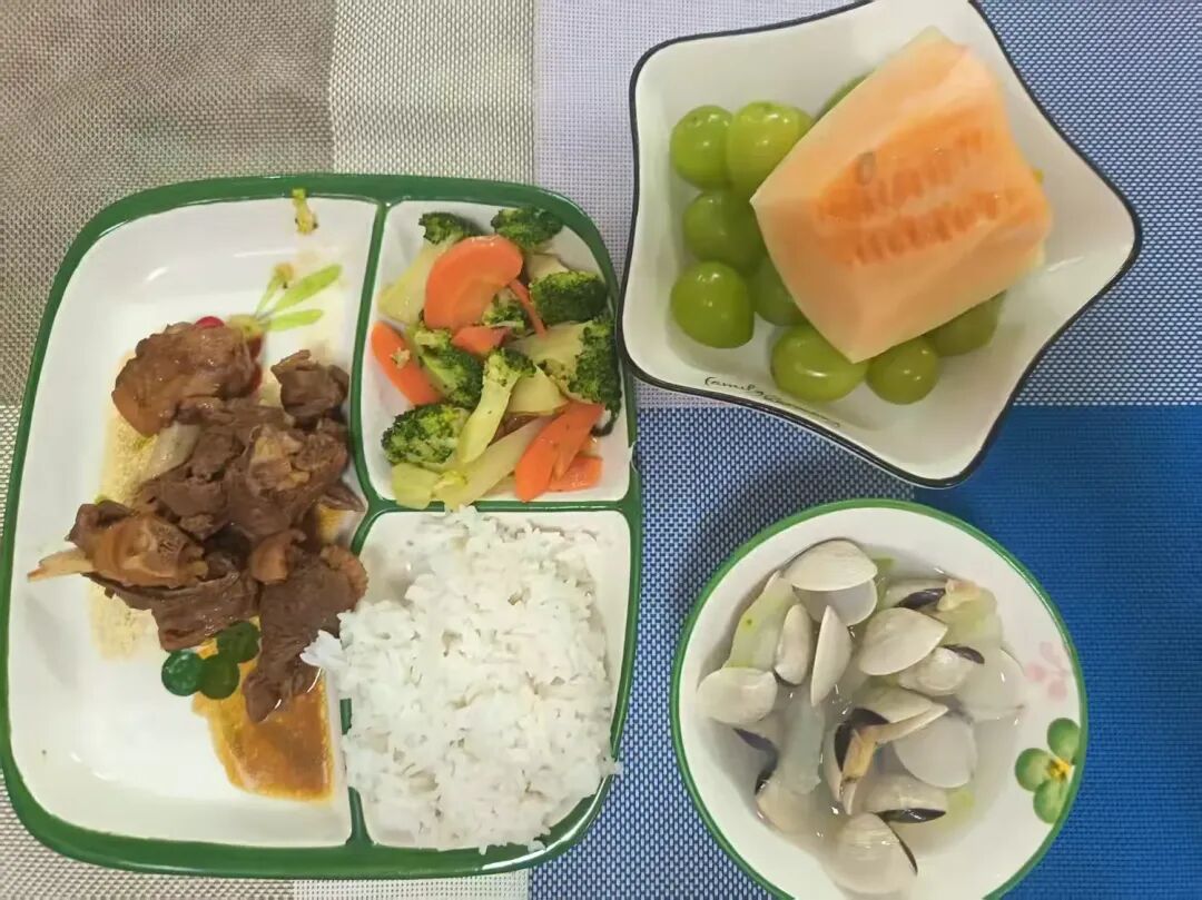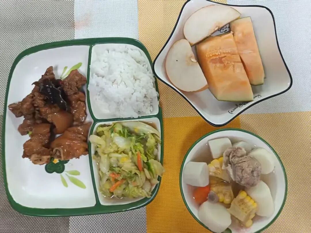 西兰花炒胡萝卜、冬瓜海白汤