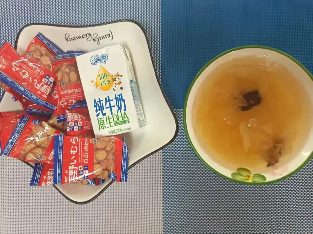 红枣雪梨银耳汤、曲奇饼干、纯牛奶