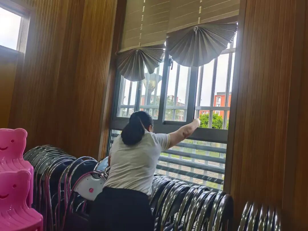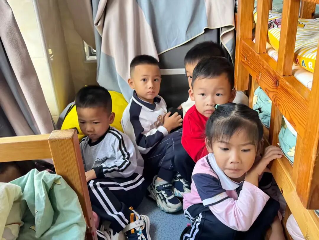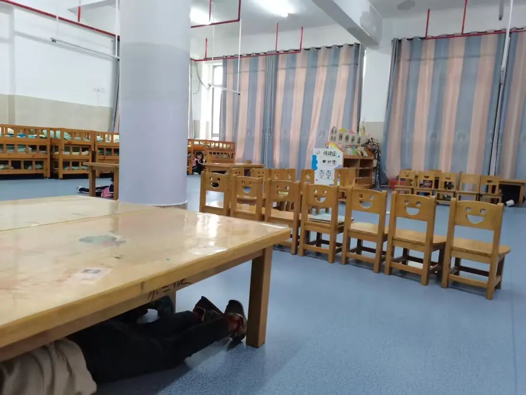 与此同时,随着警报声响起,老师们则第一时间组织幼儿躲避至安全区域,锁紧门窗并用重物堵住教室门,以防歹徒破门而入。