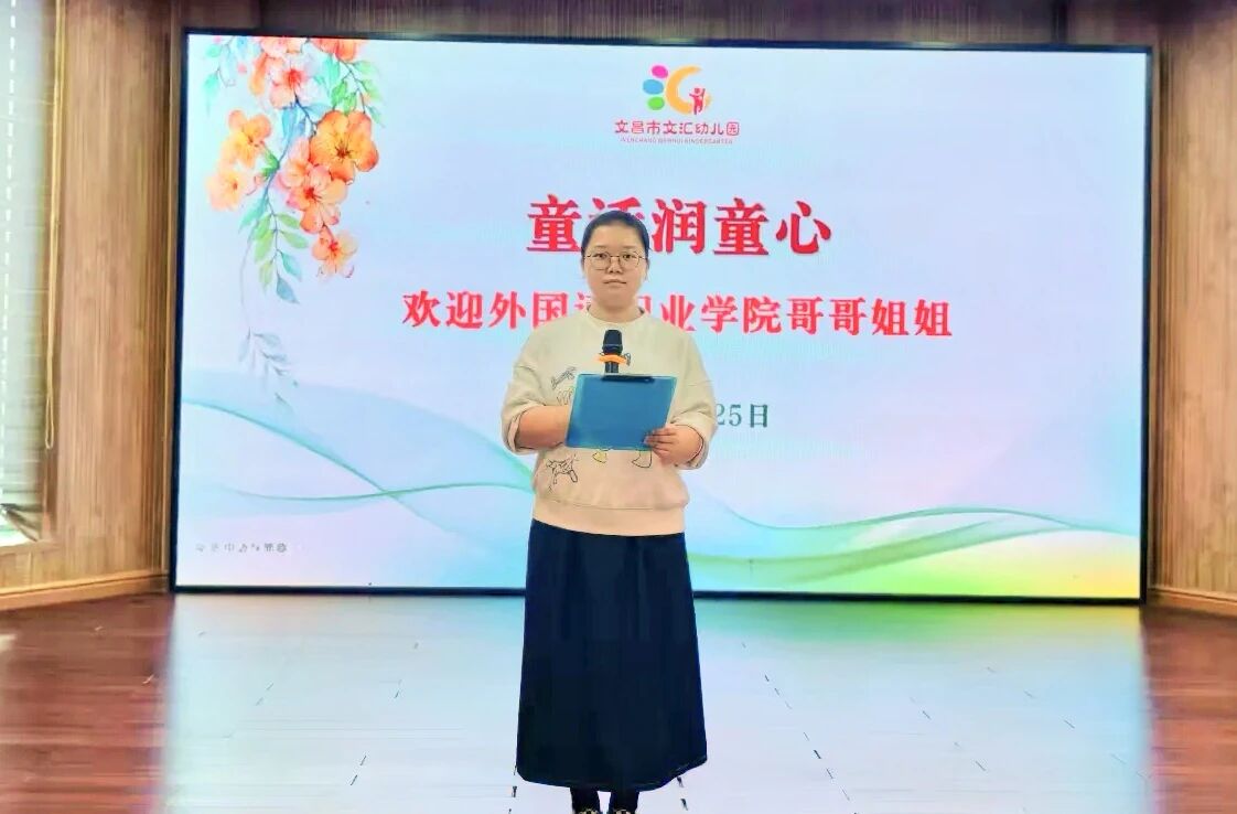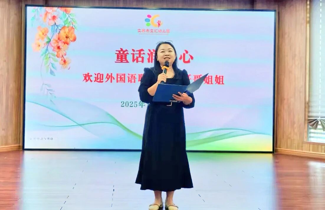 黄薇园长在活动开场前致辞,向长期支持园所活动的海南外国语职业学院师生表达热烈欢迎与诚挚感谢,肯定同学们带来的《海岛奇遇记》《疯狂的蚜虫》两部作品的价值,鼓励小朋友沉浸童话、感受美好品质,并预祝活动圆满成功。