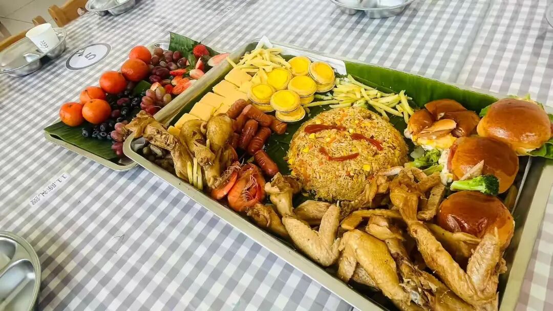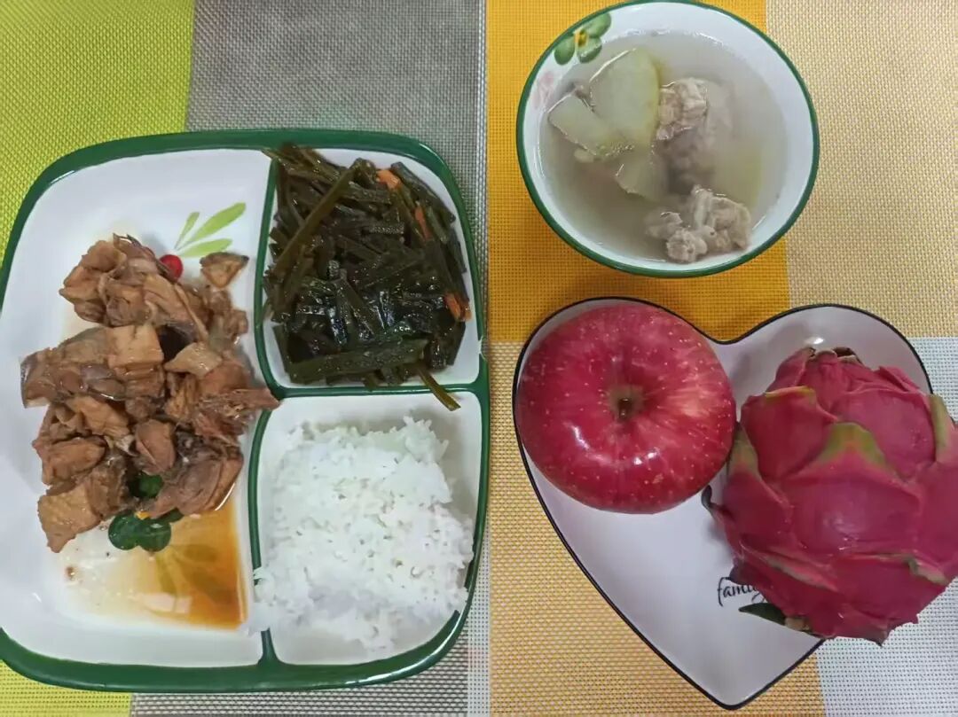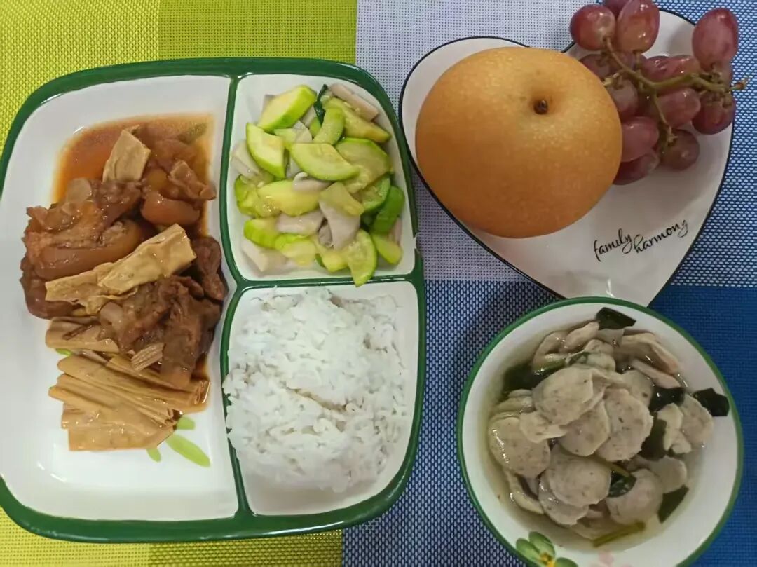 午餐:米饭+红烧猪脚+杏鲍菇炒西葫芦+菠菜丸子汤