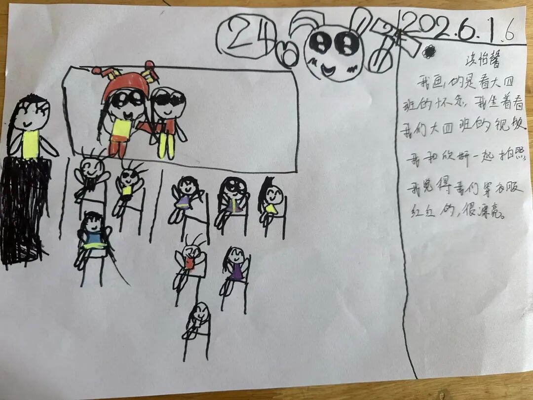 在杏杏老师的引领下,孩子们看得津津有味,不时指着屏幕中的自己或同伴兴奋地分享:“那是我!”“我们在搭城堡!”现场洋溢着认同与自豪的氛围。老师们也适时引导幼儿回顾活动中的感受与收获,鼓励他们用语言表达一学期来的成长体验,真正做到“乐享成果”。