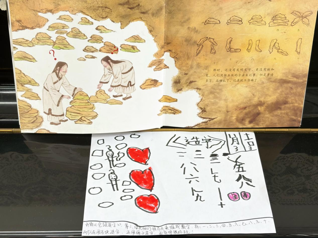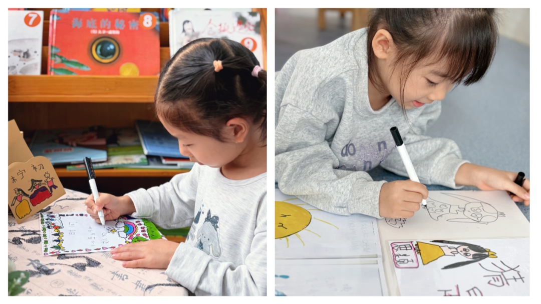 一笔一人生,一字一文化。看着孩子们对汉字越发感兴趣,教师抓住教育契机。在班里投放沙画,幼儿在汉字的世界中逐步探索与表达。以及故事引路:集体阅读《仓颉造字》《三十六个字》等绘本,让幼儿了解汉字的起源与魅力,感受每个字背后的故事。通过以上活动幼儿从“视而不见”到“主动发现”,经常兴奋地来和老师说:“老师,我认识这个“大”字!这个“口”字像张开的嘴巴!”幼儿学习的内在动机被充分点燃。幼儿的阅读表征也在悄然声息的发生着变化。