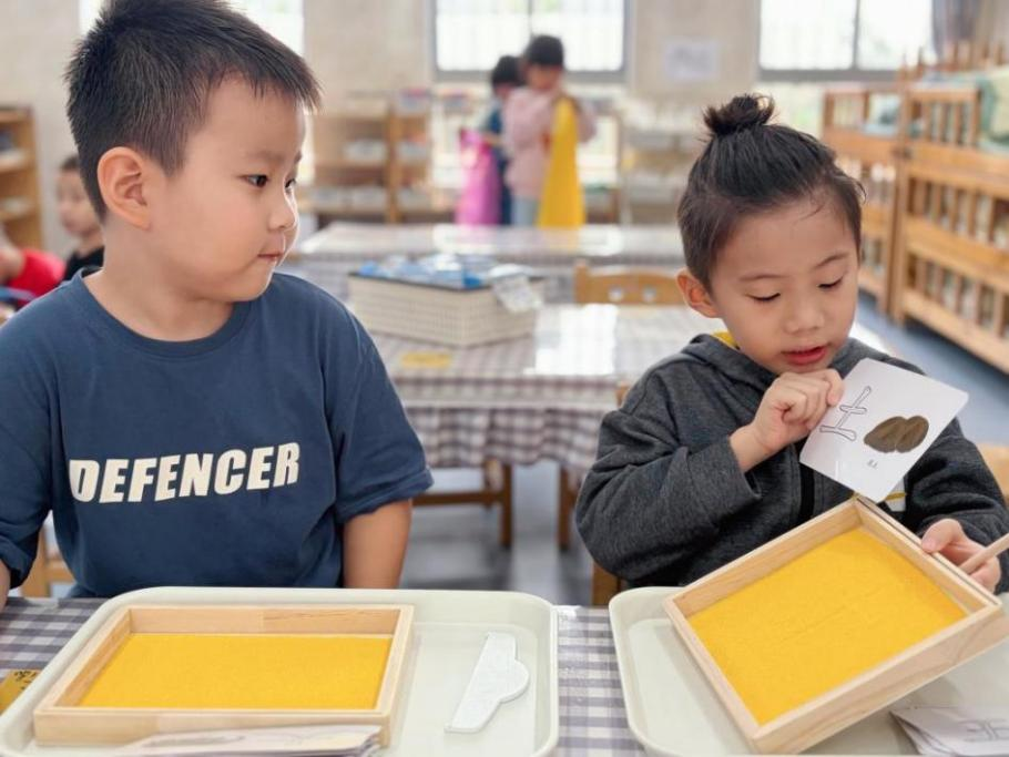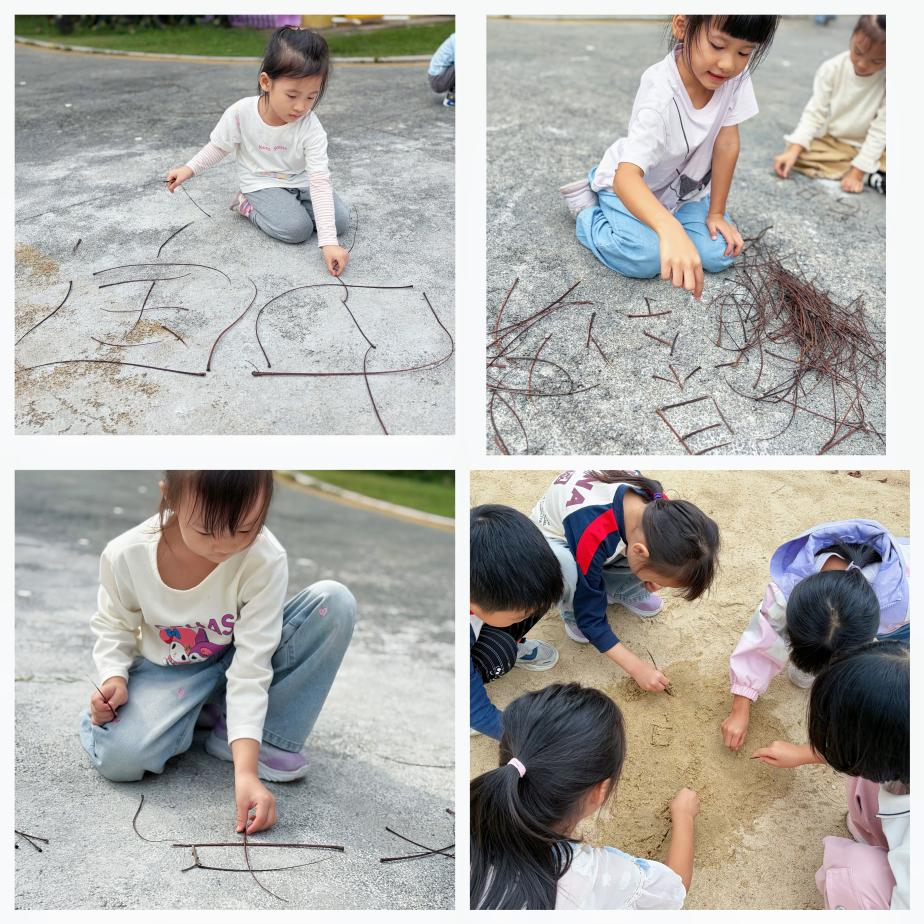 在此阶段,我们为幼儿提供了丰富多元的低结构操作材料,鼓励他们通过视觉观察、听觉辨识、触觉感知和身体运动等多种通道,全方位、立体化地探索汉字的形态之美。孩子们在户外自主游戏时,兴致勃勃地捡来树枝,在地面上拼摆出“中国”、“日”、“小”等汉字;在沙池区,他们用手指尽情“书写”,感受笔划的流动与变化。这些充满乐趣的游戏,不仅深度激发了幼儿的识字兴趣,更在无形中有效锻炼了他们手部小肌肉的精细动作能力、手眼协调性以及手腕力量,为后续的正式书写做了扎实的生理准备。