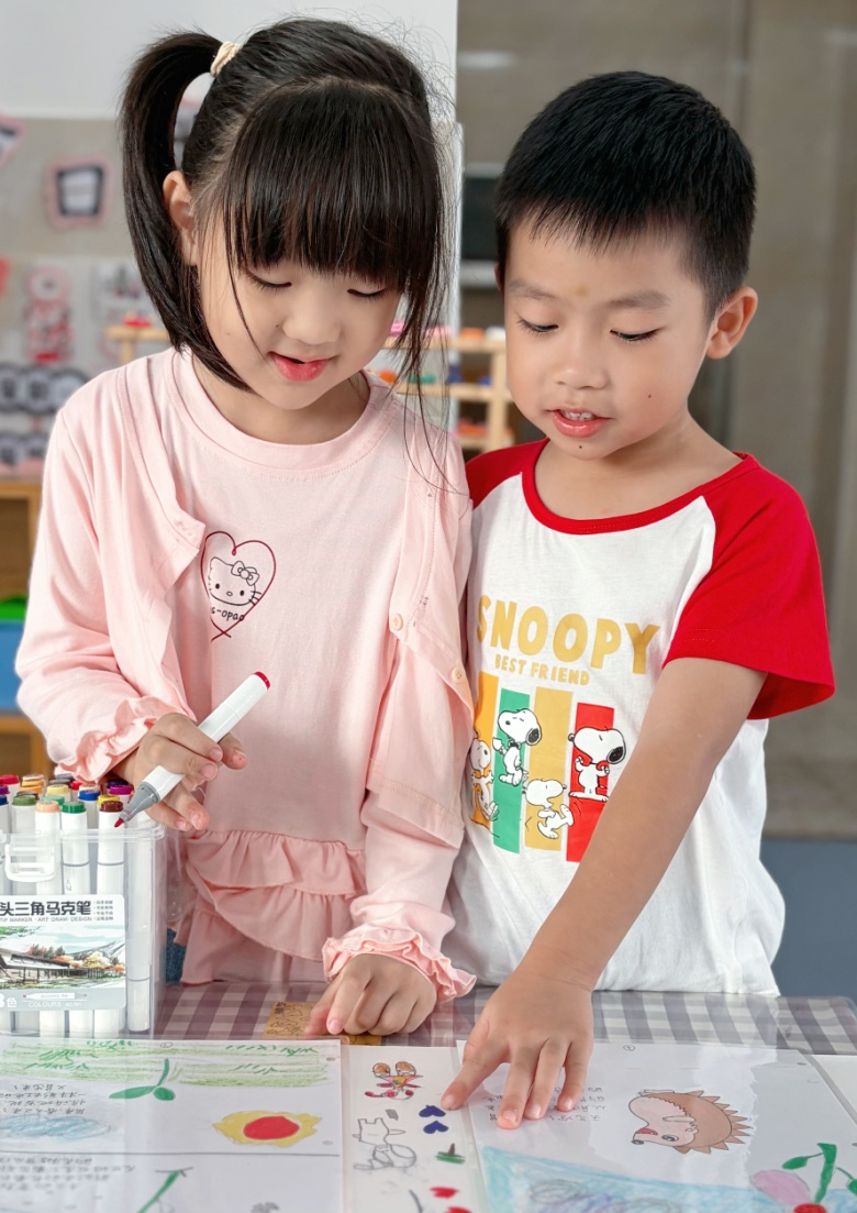 本阶段旨在为幼儿搭建多元展示平台,引导他们在分享与表达中体验成就感,增强自信心与综合表达能力。因此,我们开展了“我的绘本”创编活动,鼓励幼儿围绕自创主题,运用图画、符号及少量汉字创编故事情节,并亲手装订成册。在这一过程中,幼儿同时扮演作者与画家的角色,主动向同伴和家长介绍自己的作品。通过创作与讲述,他们的语言组织能力、逻辑思维与自我认同感得到显著提升,也在自然情境中培养了前阅读、前书写与前识字意识,同时成为记录幼儿语言与绘画能力发展的成长见证。真正从活动的“参与者”转变为“主导者”,在成就感中积蓄持续探索的学习动力。