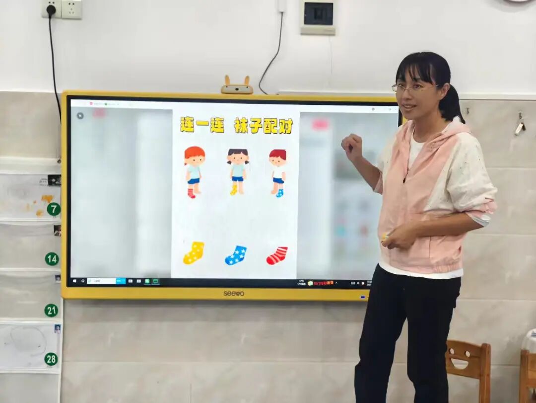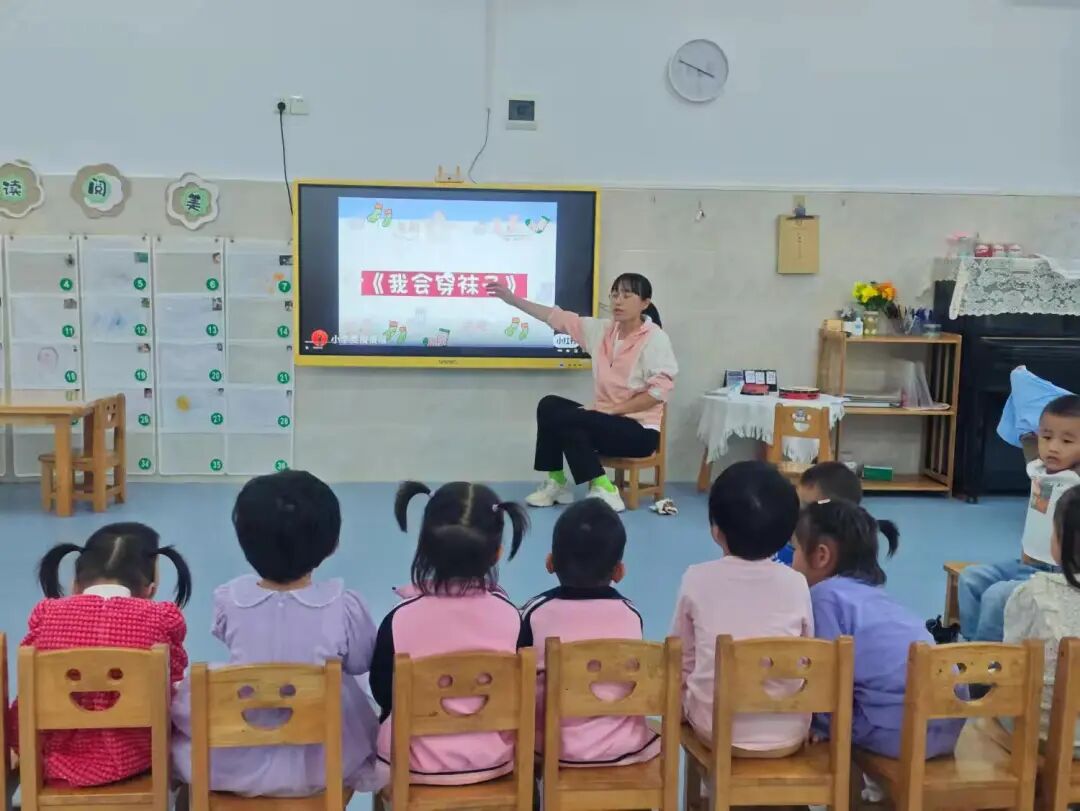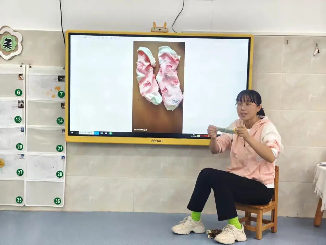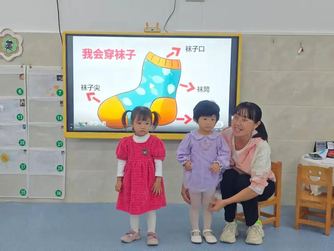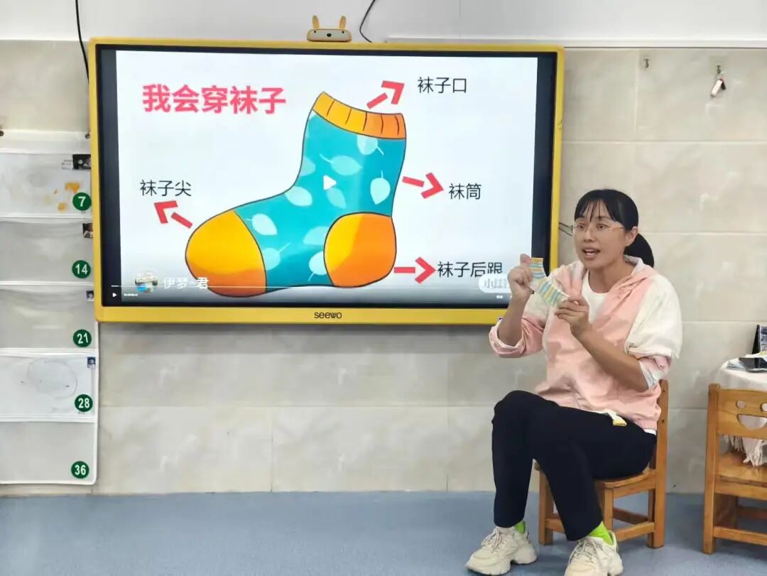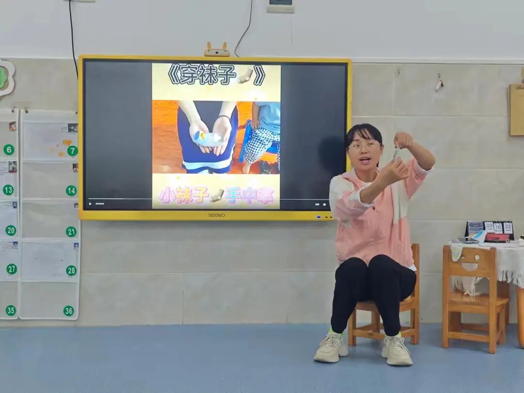 掌握袜子基本认知后,学习穿脱技能。老师用儿歌示范步骤: