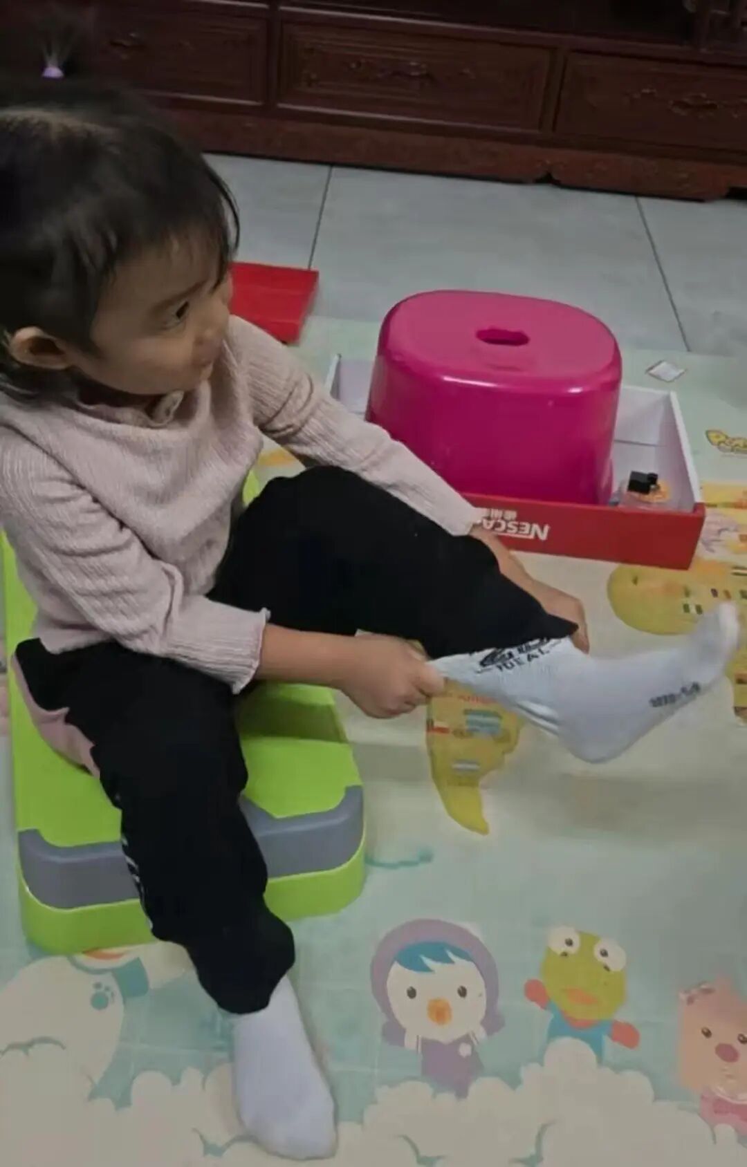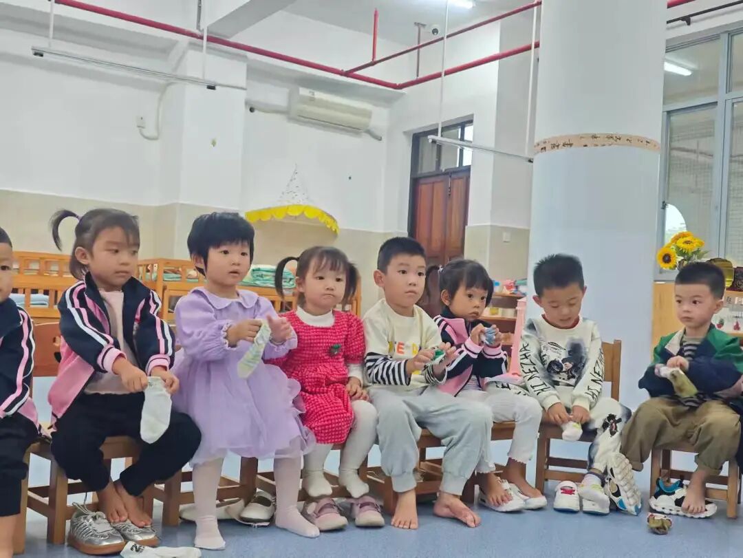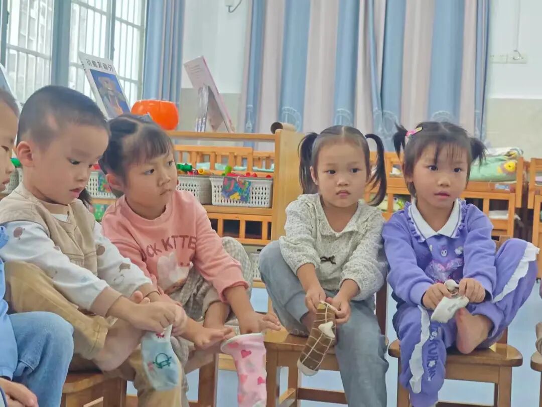 今日幼儿园生活技能课程:学习穿袜子。