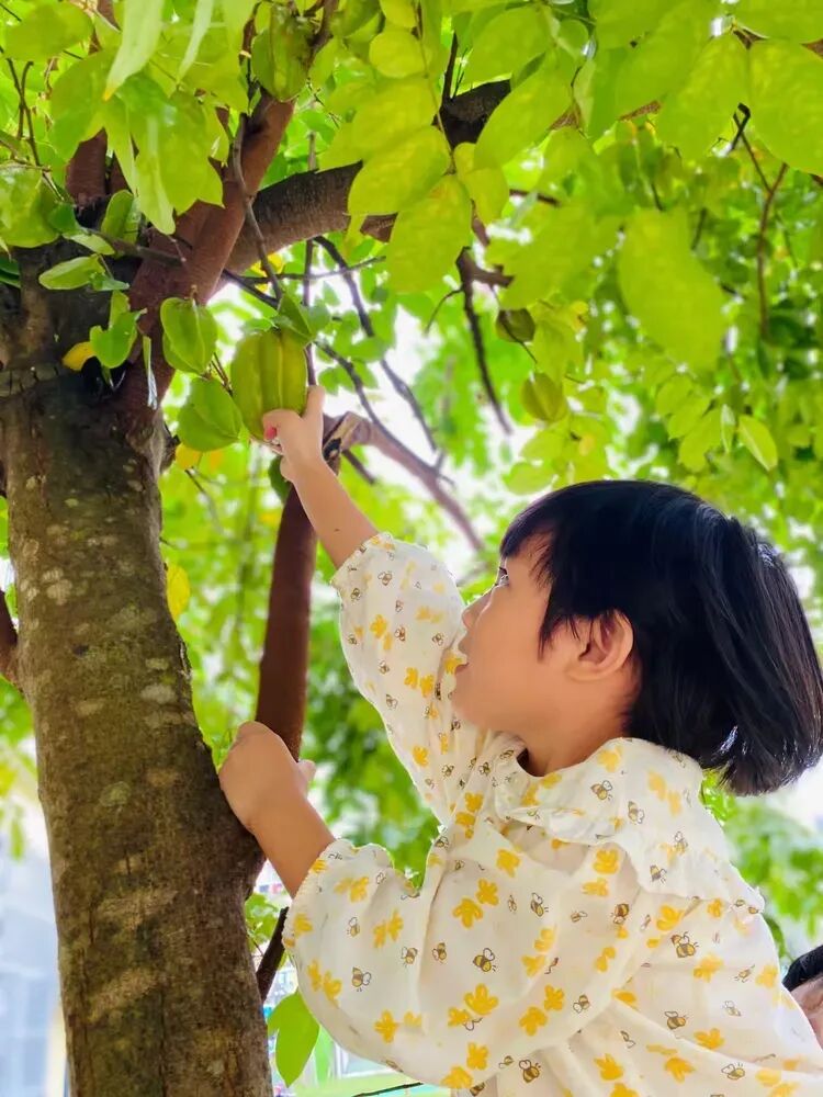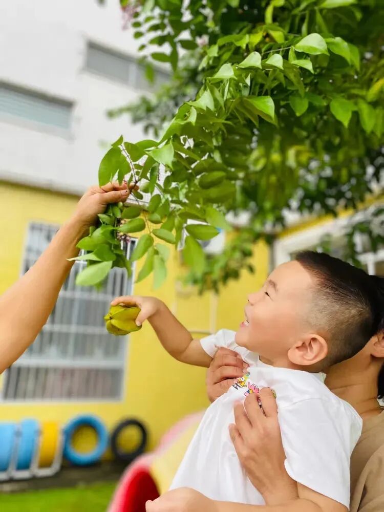 在幼儿园里,杨桃树上的果实累累,像一个个绿色的小灯笼挂满了枝头。孩子们兴奋地来到杨桃树下,仰着小脸,看着那些诱人的杨桃,口水都快流下来了。在老师的帮助下,孩子们开始体验摘杨桃的乐趣。他们小心翼翼地伸出手,轻轻摘下一个杨桃,放在手里仔细观察着。“老师,杨桃是五角星形状的!”“哇,杨桃好香啊!”孩子们的脸上洋溢着喜悦和自豪。