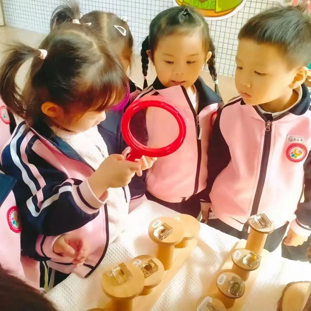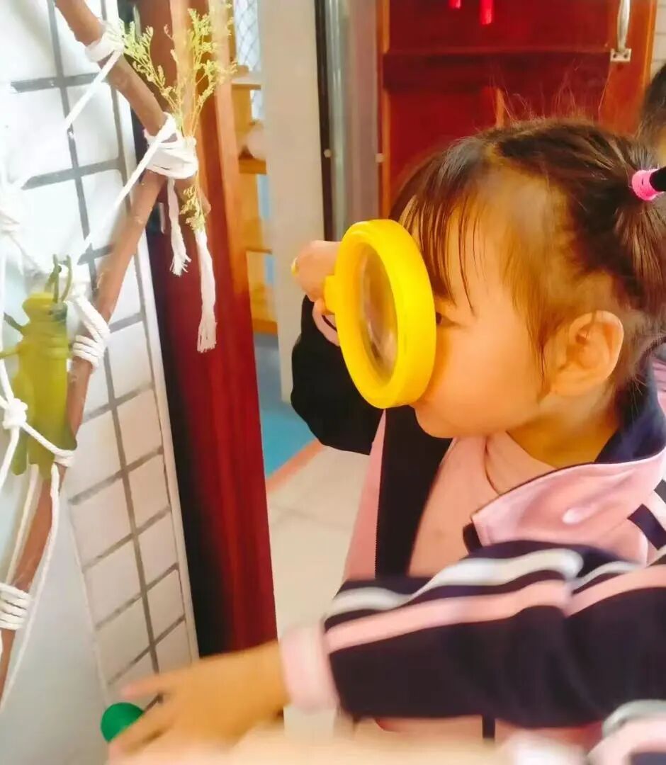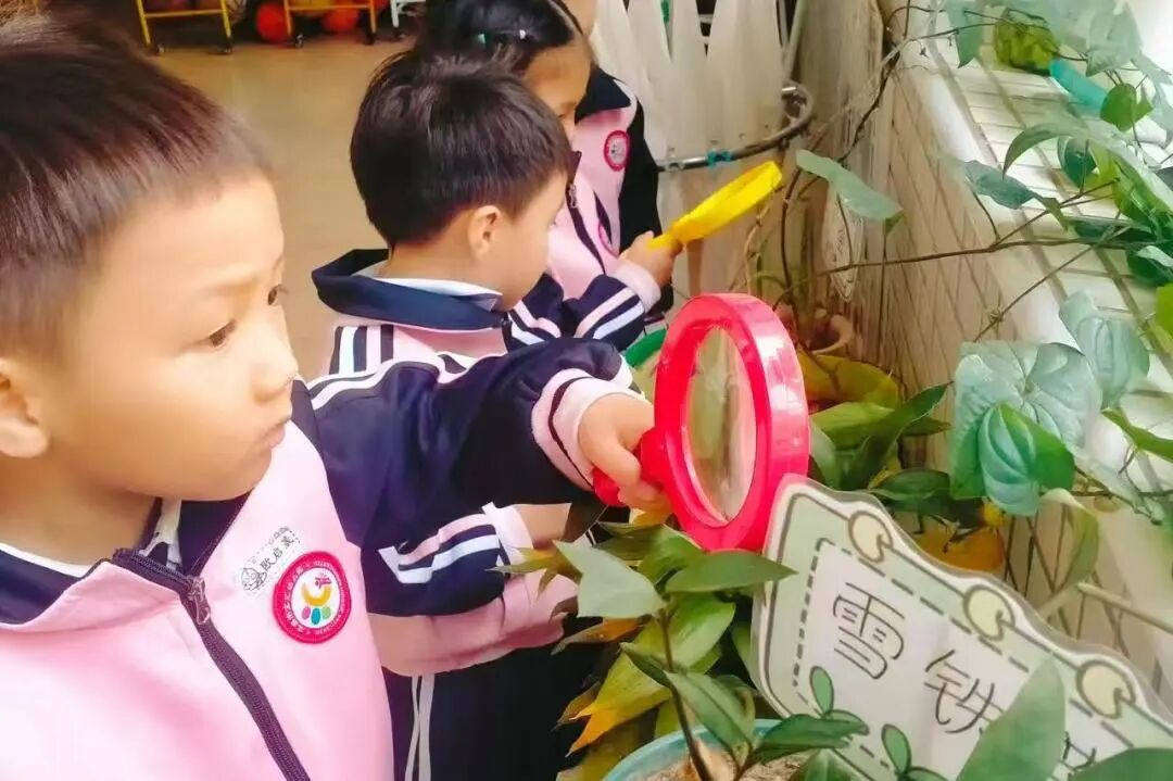 在幼儿园里,阳光暖暖地洒下。一群小朋友拿放大镜,正睁大眼睛好奇地寻找着小虫子的踪迹。