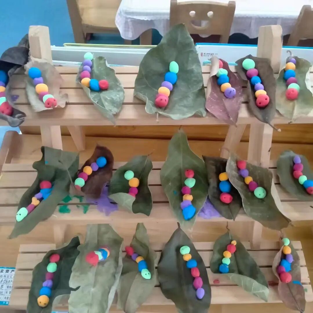 在手工活动中,孩子们发挥想象力,用五彩的粘土揉一揉、搓一搓、拼一拼,制作出一条条形态各异的毛毛虫。有的毛毛虫身上布满了漂亮的花纹,有的毛毛虫正蜷着身子“睡觉”,每一件作品都充满了童真童趣。