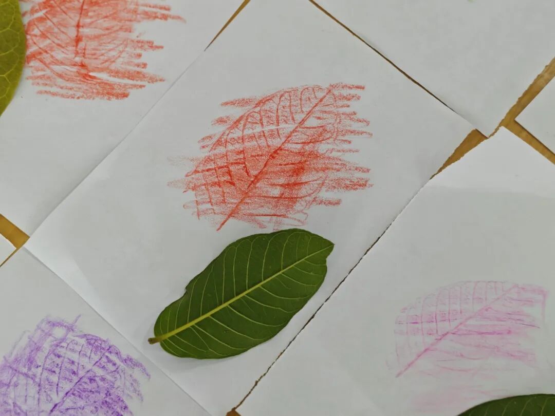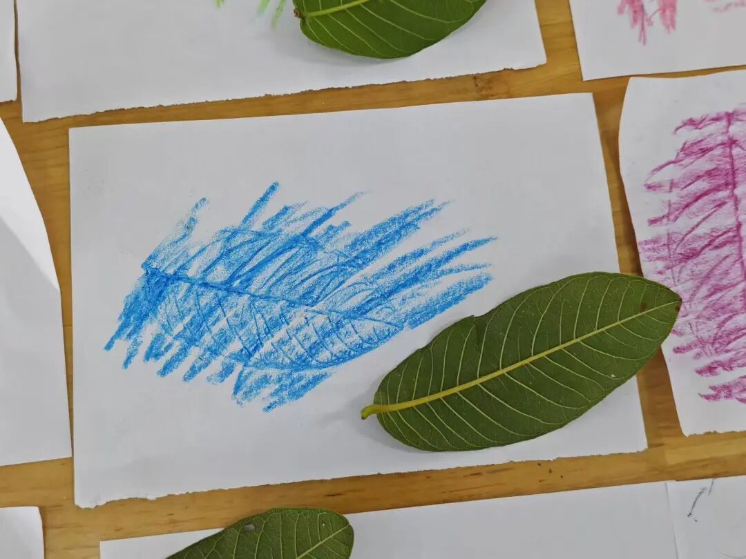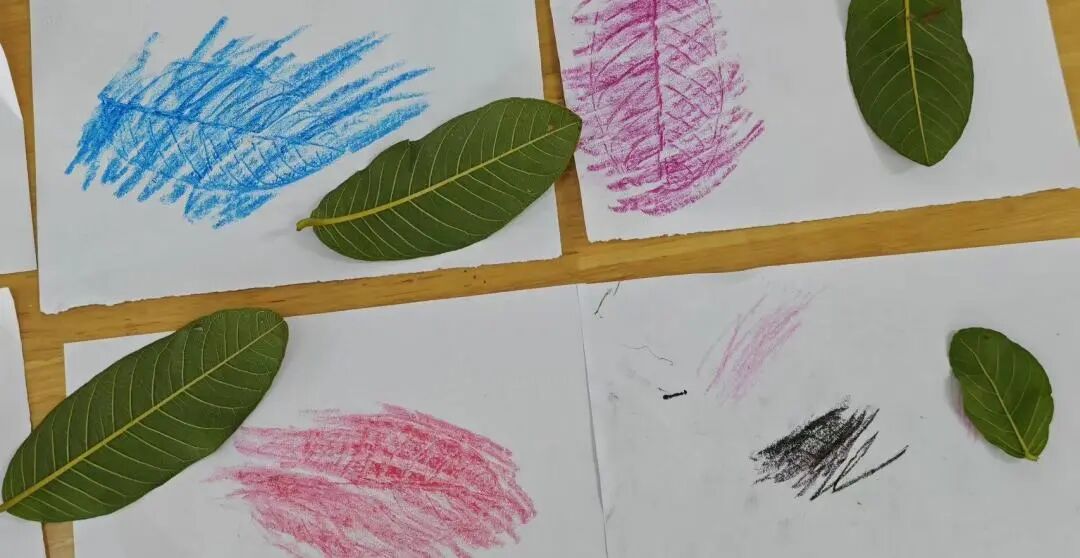 小树叶,铺平平,蜡笔宝宝来旅行!轻轻抹,慢慢蹭,叶脉纹路现原形。