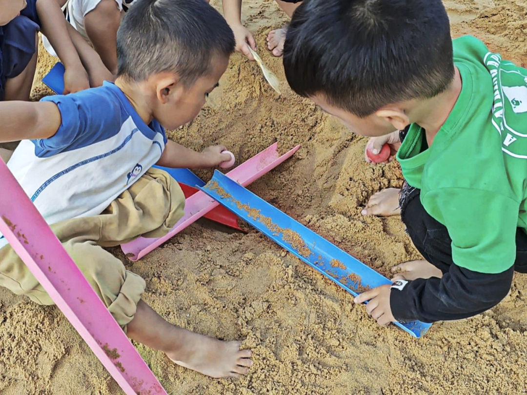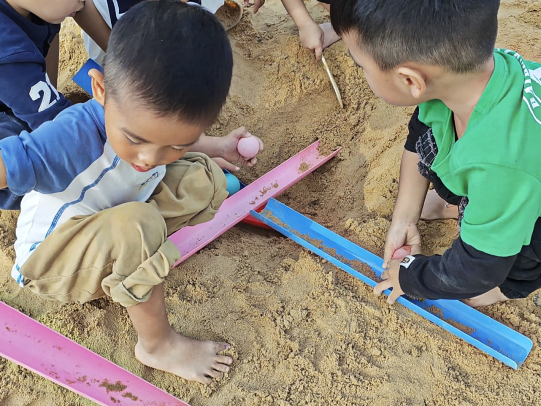 管道游戏分享活动结束后,沙水区成了孩子们热衷的探究小天地。何荣德和陈世睿两位小朋友兴冲冲地来到这里,打算解锁管道和小球的更多新奇玩法。两人先是蹲在沙地上,小手握着小铲子,你一铲我一挖,不一会儿就挖出了一个圆圆的小沙洞,这个小洞成了他们计划中的“小球终点站”。准备就绪后,陈世睿抱起U型管道,找了块稍高的沙地把管道一端架稳,形成一个倾斜的轨道。他小心翼翼地将小球放在管道高处,轻轻一松手,小球便“咕噜噜”顺着轨道滚落,精准地滑进了沙洞里。