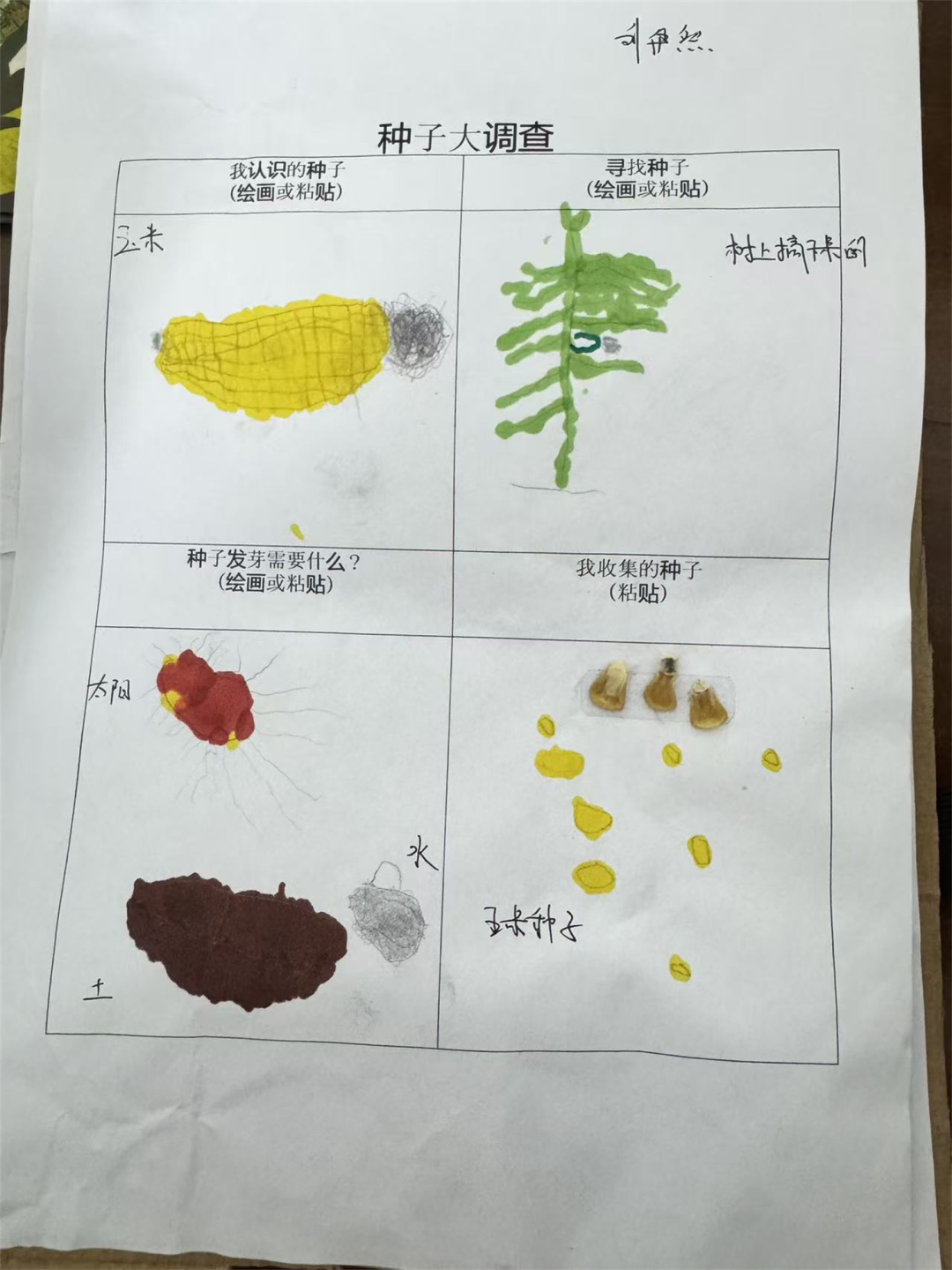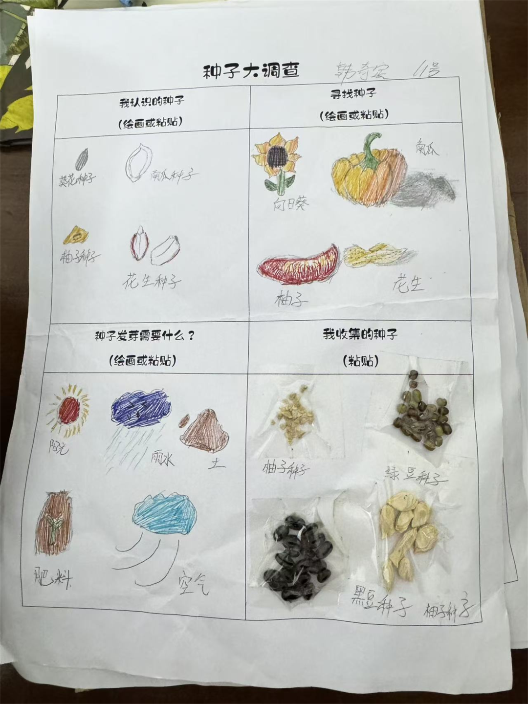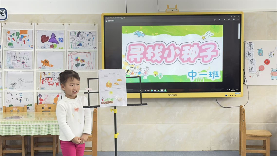 故事缘起于绘本《小种子》的奇妙邂逅。小种子闯风雨、破阻碍,终成大树的故事,在孩子们心里播下好奇的小芽芽。“种子怎么‘飞’?”“种子有‘衣服’吗?”“种子多久长大呀?”一连串童趣提问,催生出“我的种子故事”班本课程,孩子们带着问号,开启和种子的奇妙约定。