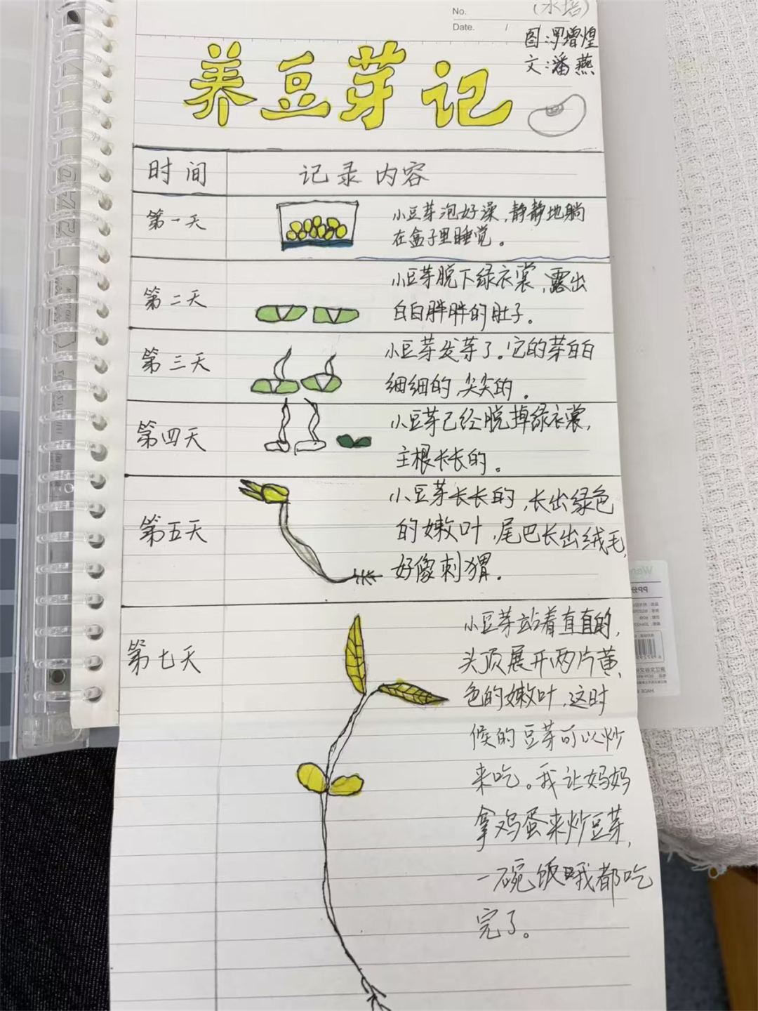 从硬豆粒到鼓胀胀,从破种皮到长嫩芽,孩子们用图画、照片记录每一步变化,亲眼见证生命的神奇力量。为了近距离观察种子发芽的全过程,班级开展了绿豆观察实验。孩子们将绿豆放入透明容器,每天记录绿豆的变化:从坚硬的豆粒到吸水膨胀,从种皮破裂到胚根萌发,再到长出嫩绿的芽叶。孩子们用图画、文字、照片等形式,详细记录下这一神奇过程,直观感受生命生长的力量。
