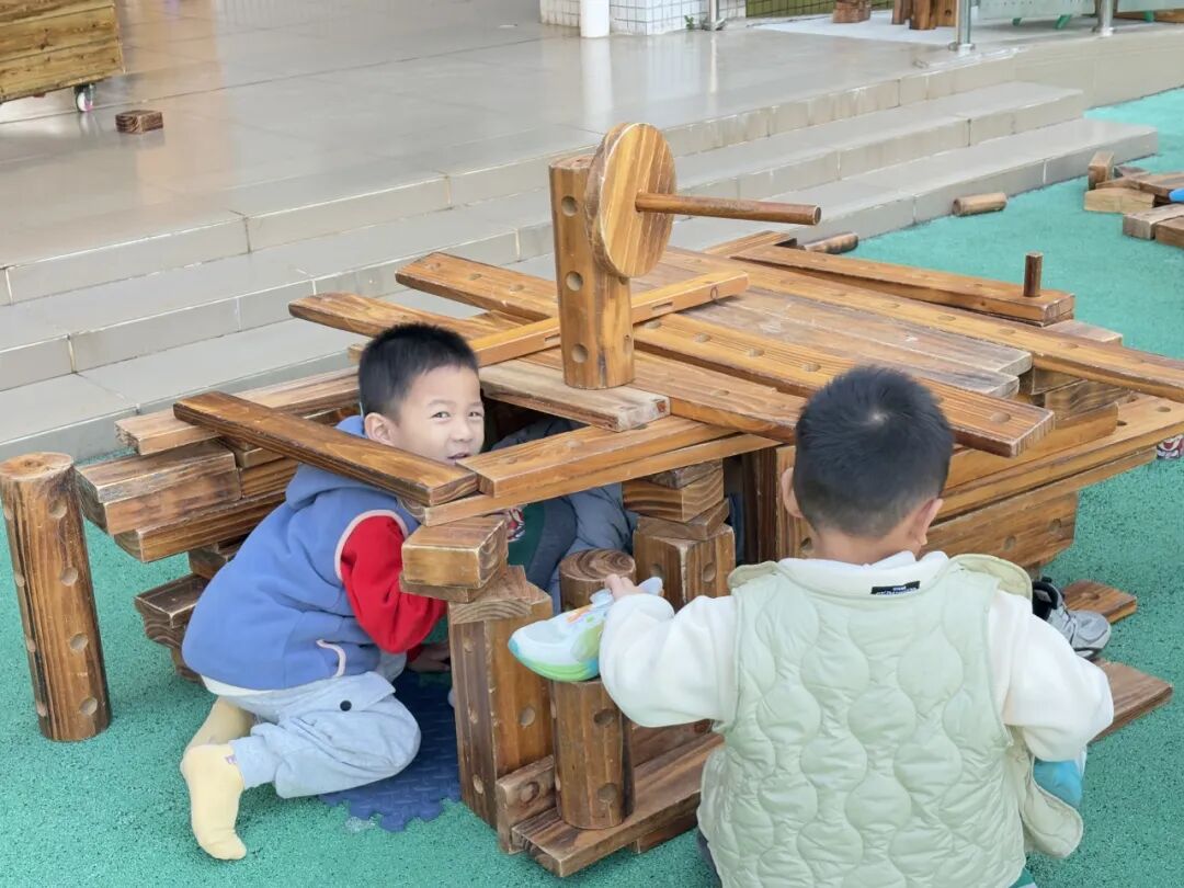 符祥坦、邢增呈以“搭一个能躲进去的小房子”为目标。增呈扶着弧形积木说:“这个屋顶总是滑,你扶稳一点,我来调整角度!”尝试3次后成功固定,两人躲进屋内,邢增呈探出头笑着说:“我们的小房子好安全呀!外面的人找不到我们!”游戏愉悦感强烈,还主动邀请旁边组的幼儿:“要不要来我们的小房子里躲一躲?”