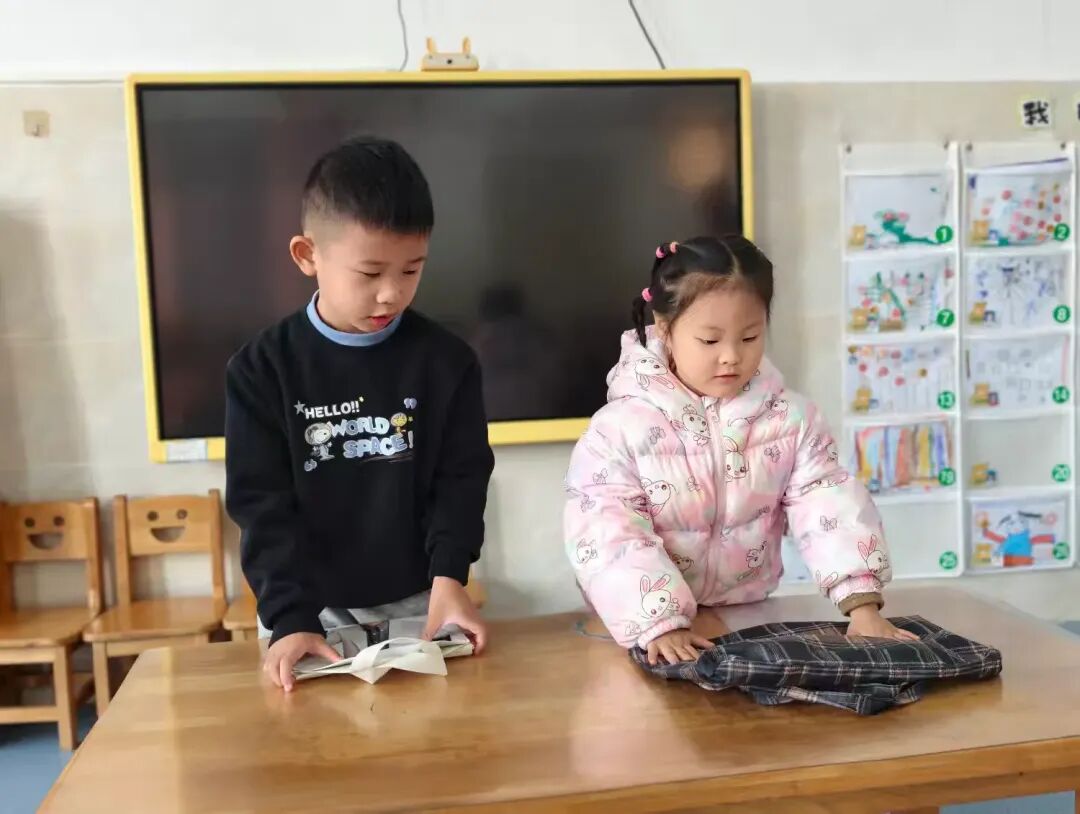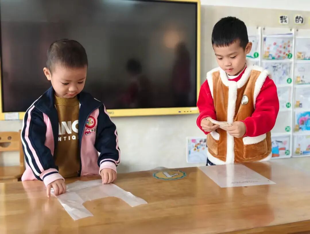 小朋友们通过比一比,叠一叠等方式,发现塑料袋是最轻便和方便携带的。