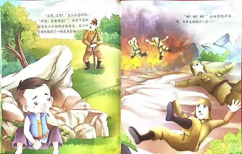 “在……在……”王二小装作吓得哆哆嗦嗦的样子说,“藏……藏在右边的小山谷里。”