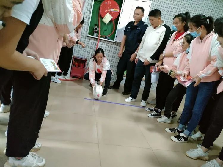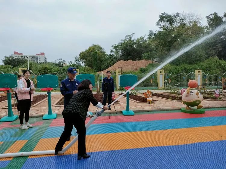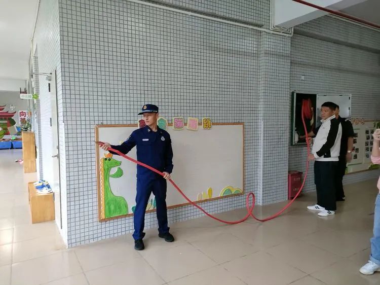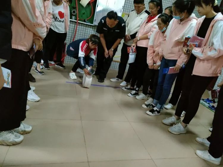 教官向老师们介绍消防栓里的器械,并实地指导消防水枪的正确使用方法。