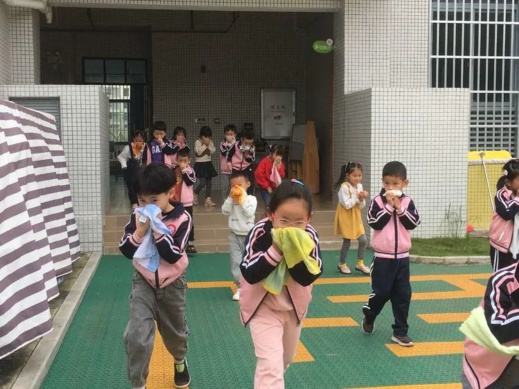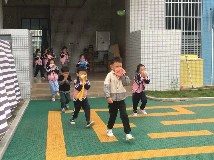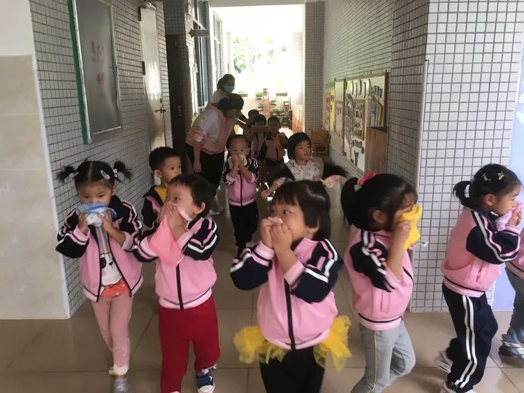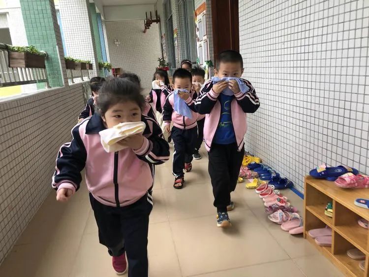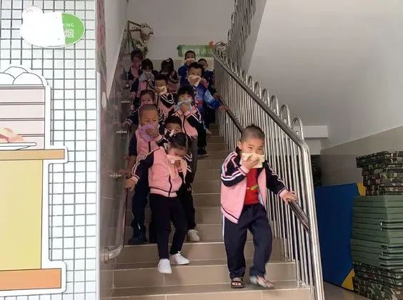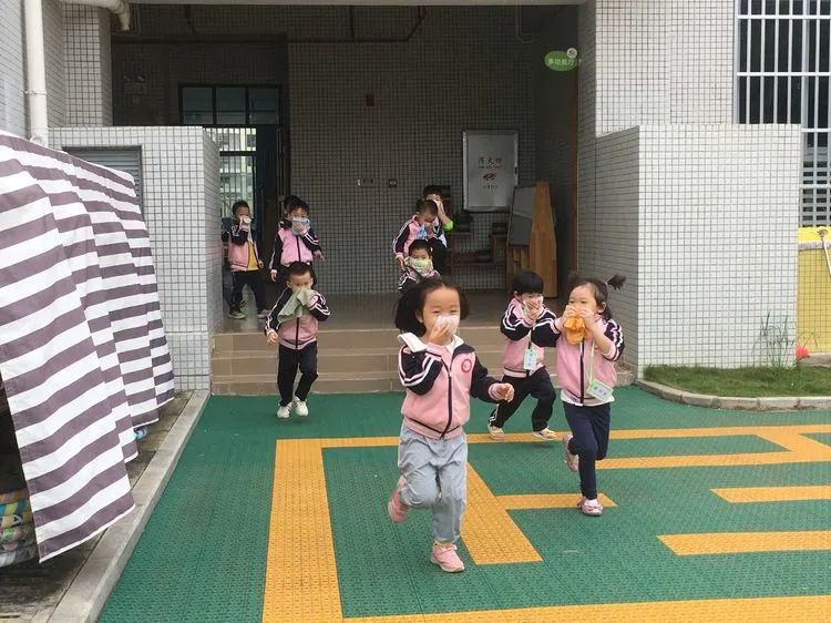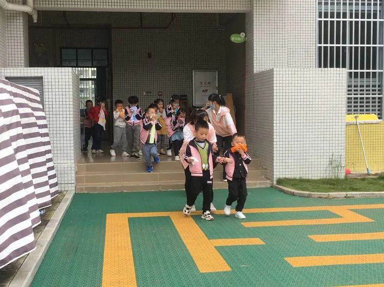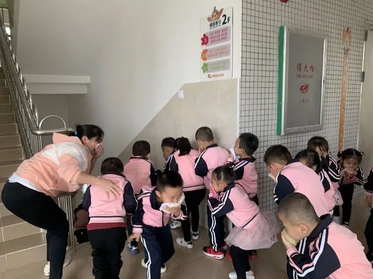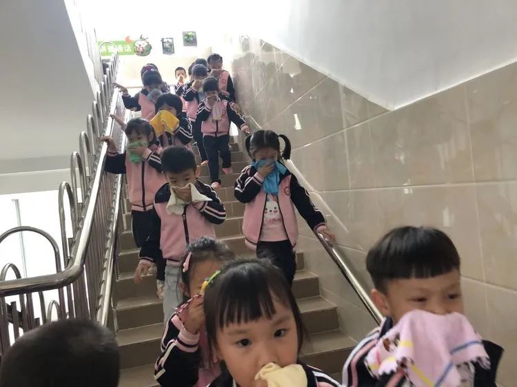 上午9:40分,伴随着警报声响起,各班老师听到警报后迅速带领活动中的孩子们捂着口鼻,弯腰扶墙有序地按规定路线到达指定的逃生安全区域。