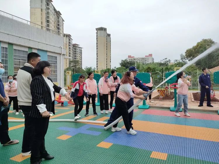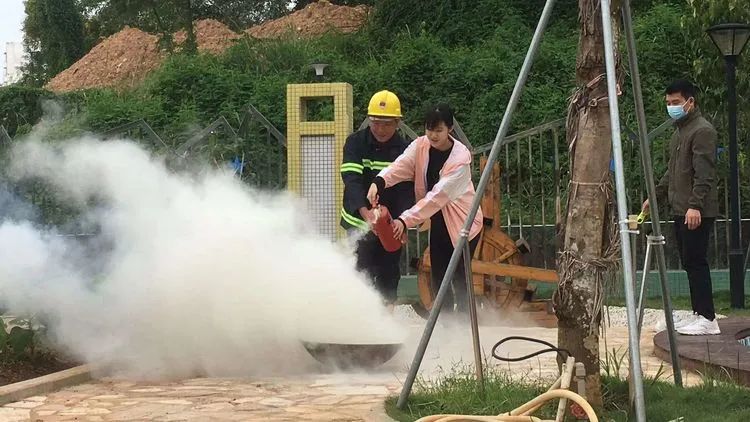 老师们和小朋友们在吴老师的帮助下,进行实操使用灭火器灭火。