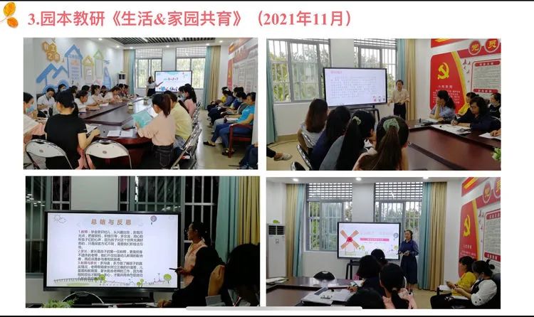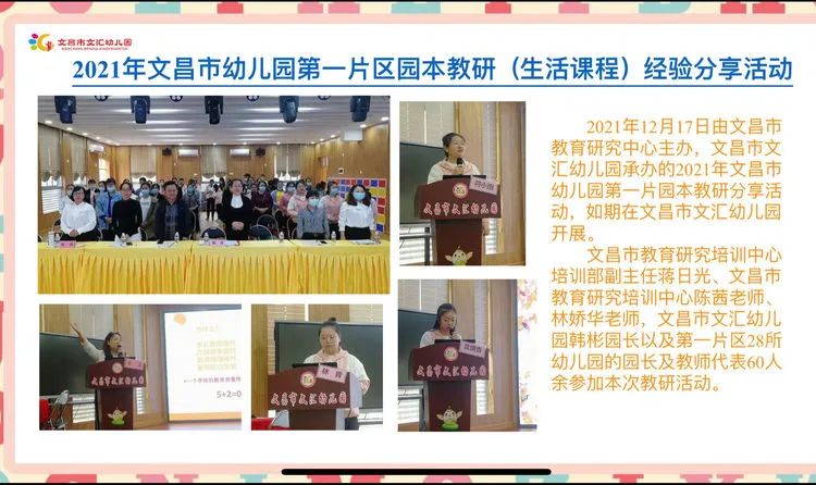 观摩结束后,文昌市文汇幼儿园黄薇副园长分别从园本概况、现状分析、生活课程优化历程等与大家讲解了园所的基本概况及园本生活活动的教研路径。