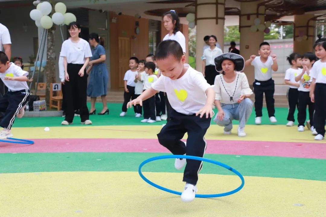 孩子们精神饱满地表演着自己班级特色呼啦圈操,动作张弛有度,充满活力。