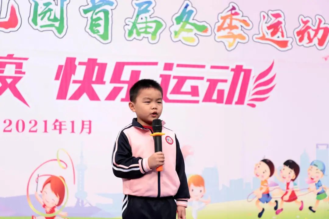 运动员入场结束,接下来幼儿代表梁博豪发言:“我运动,我健康,我快乐,我阳光,童心抗疫,快乐运动!”